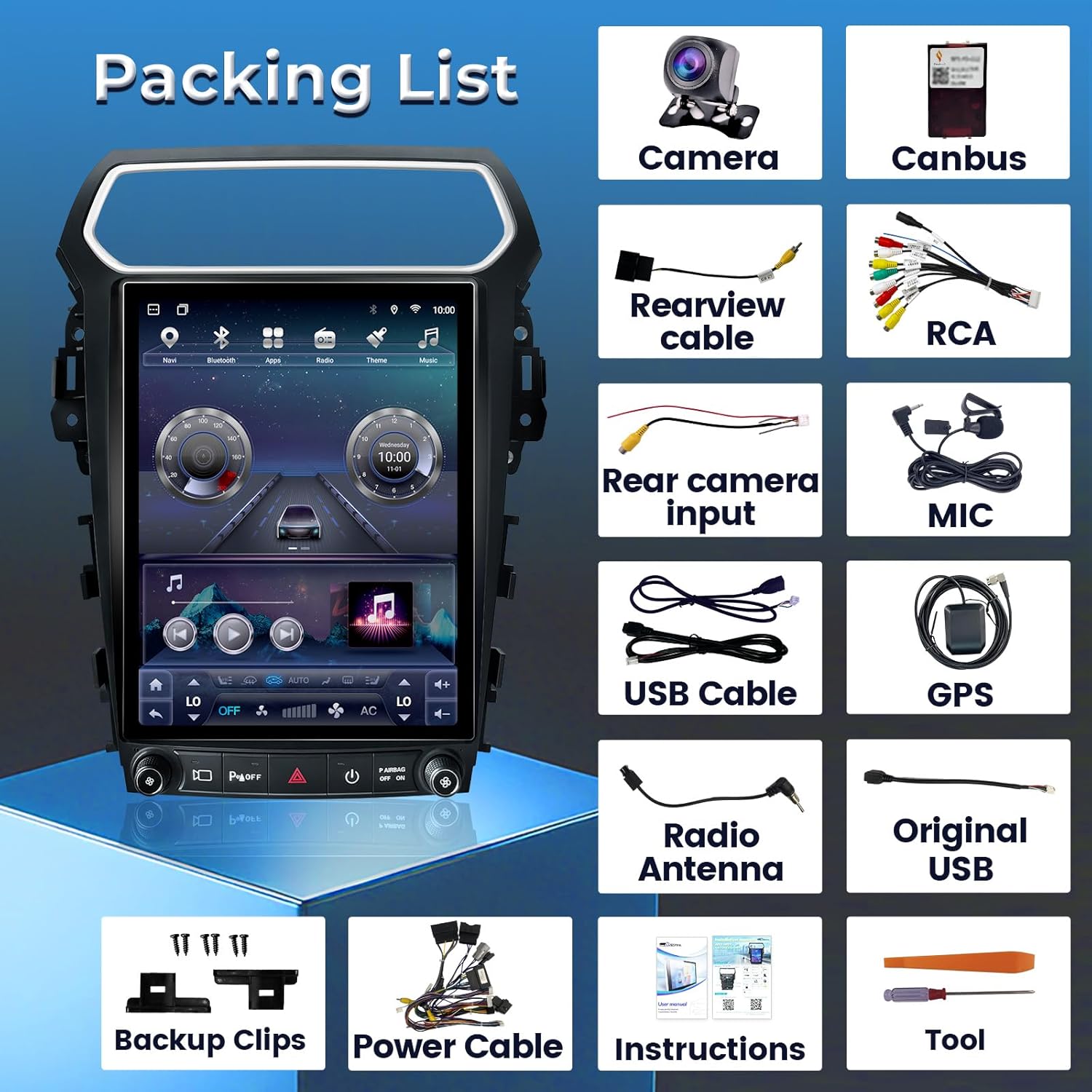 | BuiltIn Media | 1080P backup camera * 1, Car radio * 1, Function instruction * 1, Installation instruction * 1, Installation kit * 1 |