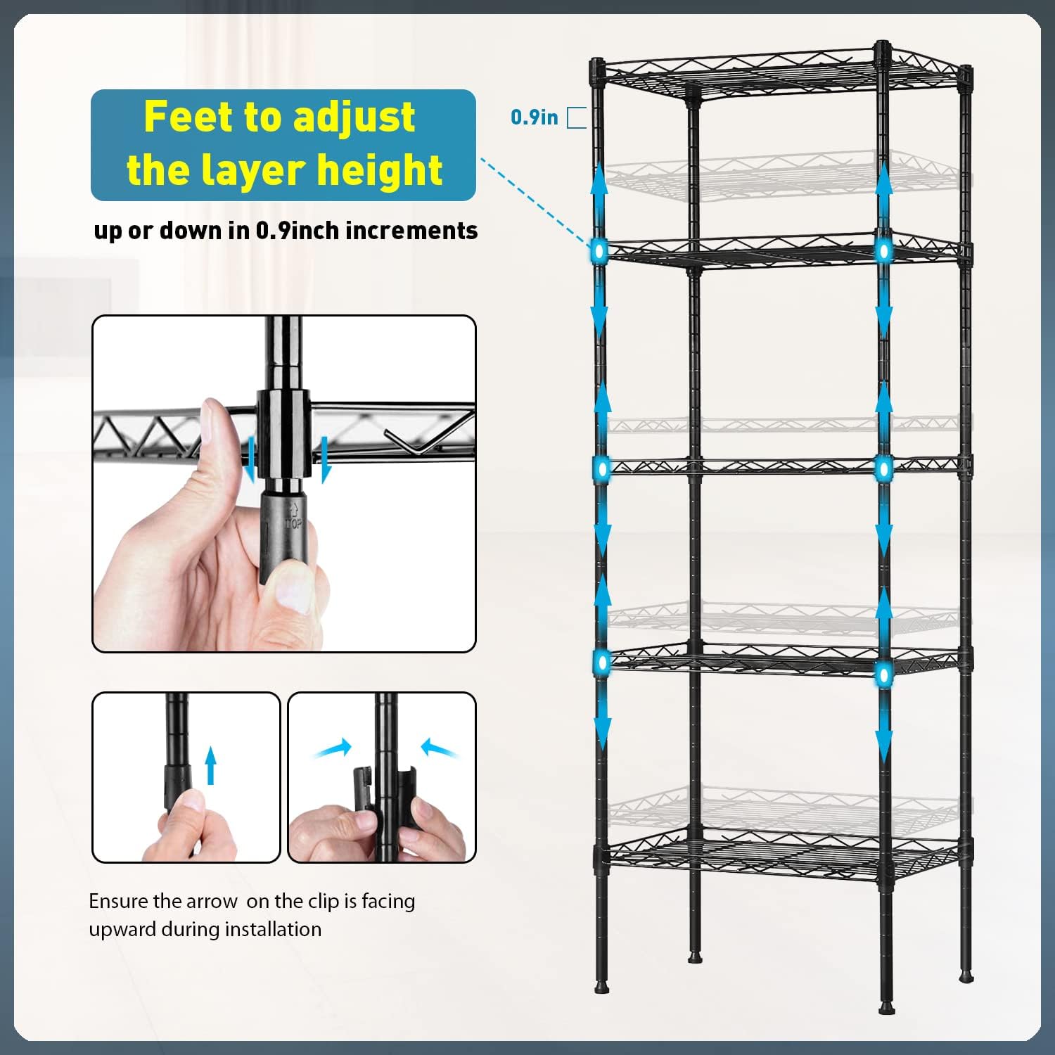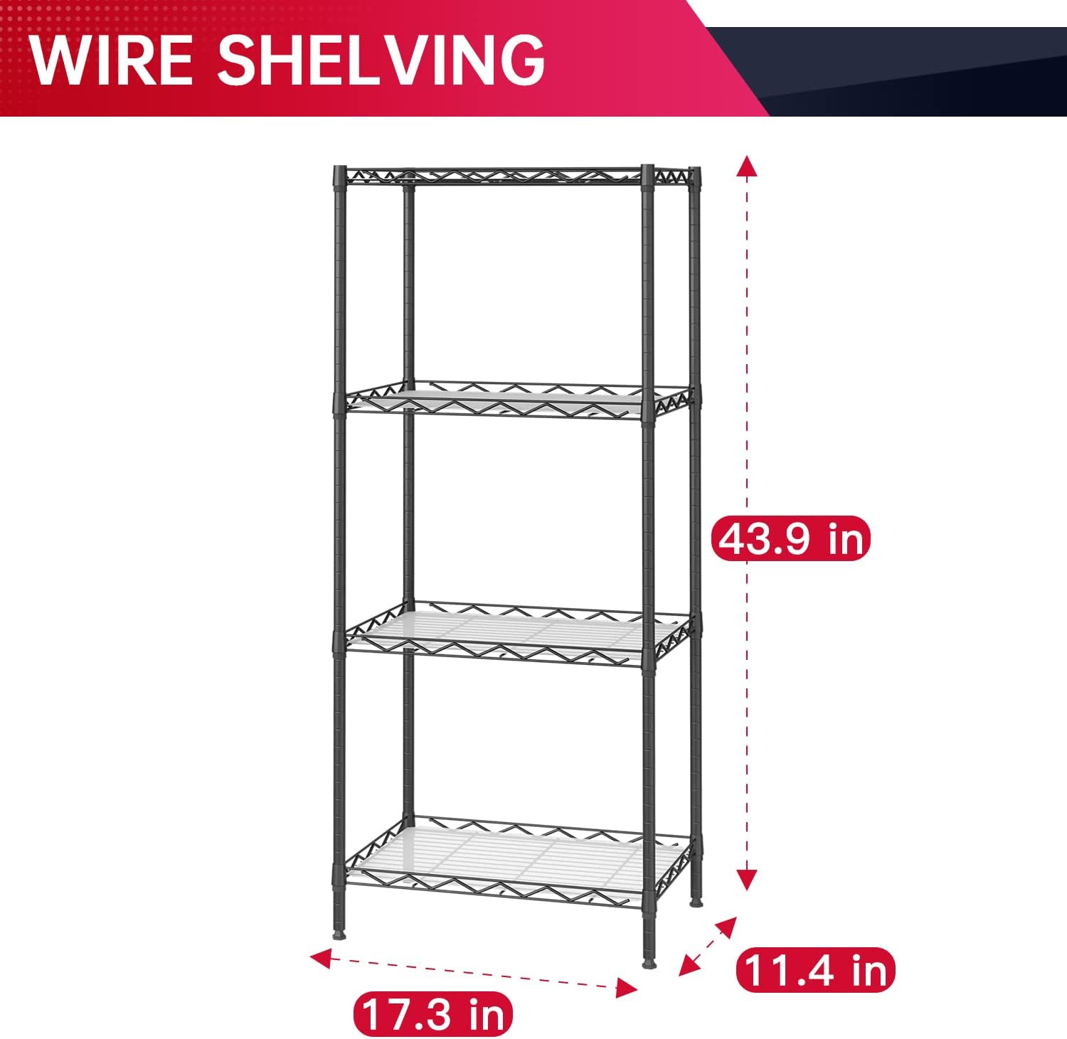 This is 4 tier wire shelf,all the shelf is can adjust height .The shelving unit is made of steel wire shelving.The weight limit for each shelf is 250 pounds, and the total weight limit for the entire shelf is 1000 pounds. The storage shelves provide an enormous amount of space for you and no occupy too much space.You can use this wire shelving in the kitchen bedroom garage and more. Tools, books,and other things can be placed on this wire shelving. Feature Easy to assemble, no tools needed. Improve addition space, no occupy too much space. Adjustable wire shelving,Easy to store things. Sturdy metal construction,can withstand heavy objects. Brand new and high quality. The surface of the garment rack is black paint plated. Works Anywhere,suitable for bedroom, cloakroom, laundry room,store clothing, shoes, socks, bags Rack storage shelves wire shelf wire shelving unit rack storage shelves shelving wire shelf shelving unit wire shelving metal shelf metal rack storage shelf metal shelves wire rack garage shelving Metal Shelving wire shelves heavy duty shelving rack shelf white shelving unit Storage Rack metal