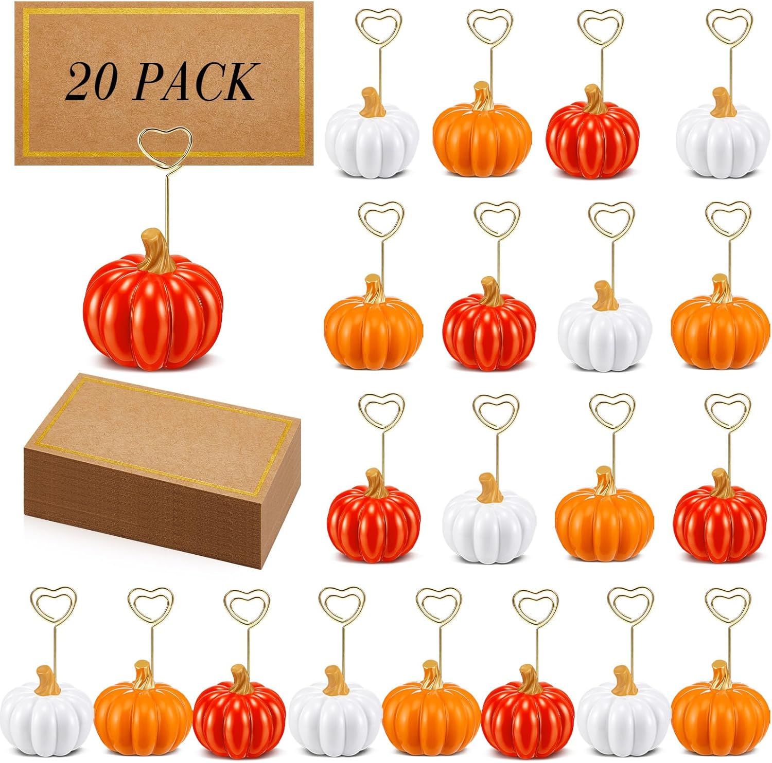 Features: Long lasting to use: Combined with the serviceability of the paper place cards, this pairing provides an effective and reliable way to display your cards, making them suitable for repeat use in different events and occasions. Elegant design: Leave a lasting impression on your guests with these gorgeously designed pumpkin place cards. Their leaf details, along with the quality materials applied, render an eye catching elegance that adds to the warm, inviting atmosphere of any autumn event. Specifications: Material: Pumpkin placecard holder: resin, chrome plated stainless steel Table place card: kraft paper Placecard holder color: gold Pumpkin card holder color: gold Size: Pumpkin placecard holder: 3.2'' in height, 1.6'' in diameter Table place card: 3.2 x 2 inches Package includes: 20 x Pumpkin placecard holders 20 x Table place cards Notes: Manual measurement, please allow slight errors on size. The color may exist a slight difference due to different screen displays