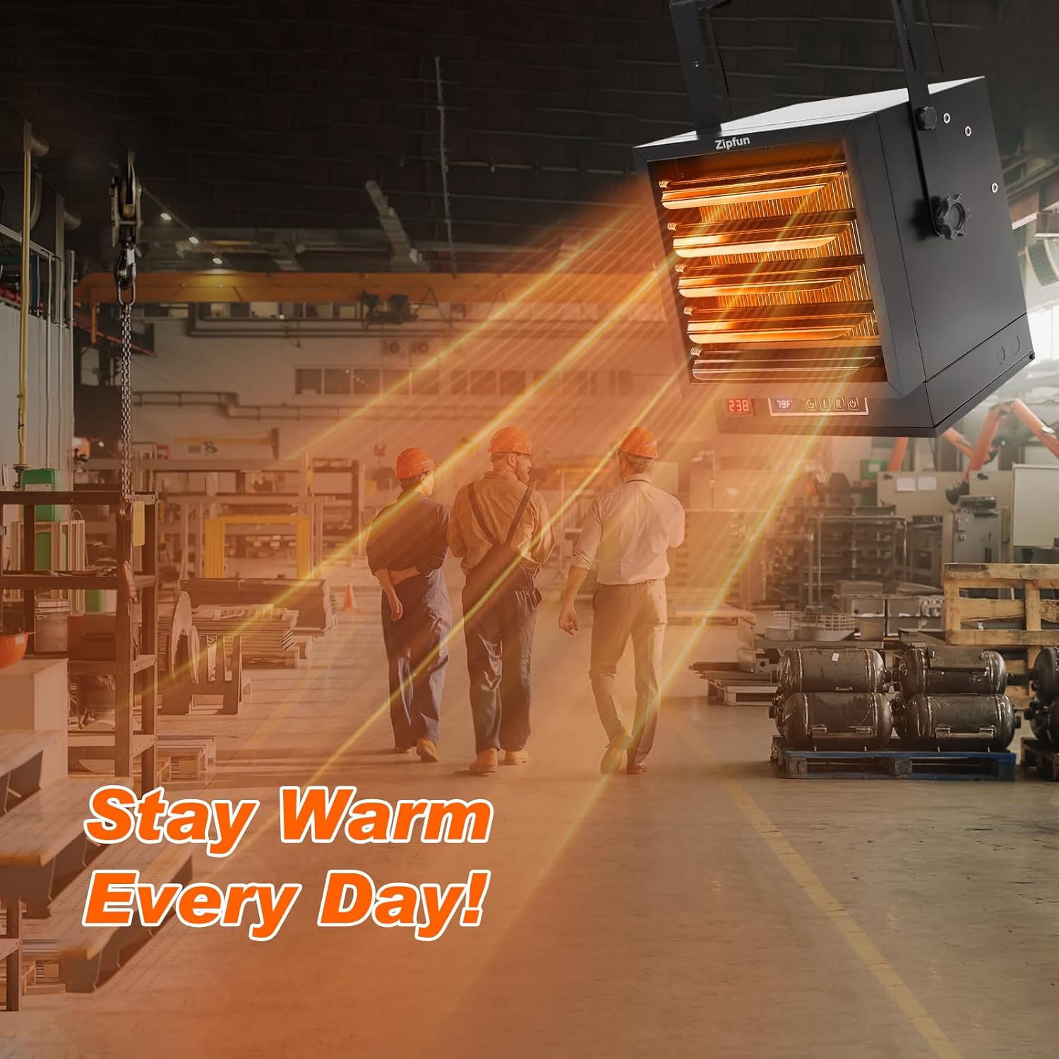 Add Warmth and Comfort to Your Garage or Indoor Shop Space with a Fan-Forced Electric Heater If you’re someone who routinely spends time working out or working hard in their garage, workshop, “she shed”, or other commercial space you know how cold it can get in the winter months. And if you don’t have a high-quality heater to keep your space warm it’s either completely unusable or miserably cold. That’s why we developed the ZIPFUN 8,500W Electric Garage Heater with full-function remote. This premium indoor heater mounts to the ceiling and provides warm, reliable heat distribution across a large garage or shop space, so you can continue using the space no matter the season. Easy to install and designed to give you more control over your heating needs, this is a must-have for indoor areas that need to stay warm year-round or in colder months. Product Details: 1: 8,500W Electric Garage Heater 2: Full-Function Remote Control 3: LED Touchscreen Display 4: 3 Heat Settings: 8,500W(Hig), 5,600W(Low), Fan Only(FA). 5: Built-In Adjustable Thermostat 6: Overheating Protection 7: ETL Certified 8: Variable Mounting Angles 9: Adjustable Louvers