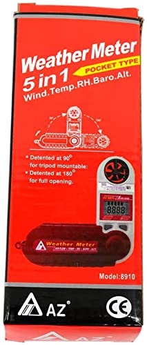 AZ8910 Air Flow & Barometric Pressure Anemometer Pressure Range:400~1100 mbarModel:8910Wind Speed Range:0.5~44.7 M/H, 60~3937 FT/M, 0.4~38.8 KNT,1.1~20.0 m/s, 0.7~72.0 KMH, 1~8 BFWind Speed Accuracy:±(3% of reading+0.2 m/s)Air Temperature Range:-15.0~50℃Air Temperature Resolution:0.1℃, 0.1℉Air Temperature Accuracy:±1℃Air RH% Range:5%~95%RHAir RH% Resolution:0.1%RHAir RH% Accuracy:±3%RH (at 25℃. 10~90%RH, others ±5%RH)Pressure Range:400~1100 mbarPressure Resolution:1 (400~1100 mbar/hpa), 0.1 (11.8~32.5 inHg)Pressure Accuracy:±3 hpa (at -10~60℃)Altitude Range & Res.:-274~2743 M (1M), -900~9000 Ft (3 Ft)Altitude / Pressure Update:60 secondsWind Speed Response Time:2 secondsTemperature Response Time:60 seconds (typical)Air RH% Response Time:60 seconds (typical)Pressure Response Time:15 minute (typical)LCD Update:Every secondWindchill Display:YESDew Point Temp. Display:YESHeat Index Display:YESAltitude Display:YESLCD Size:28(L) * 16(W) mmOperating Temperature:-15~50℃Operating RH%:Humidity <80%Storage Temperature:-20~50℃Storage RH%:Humidity <90%Weight:~90gOptional Accessory:Replacement Mini VaneStandard Package:Meter, Manual, Strap, Paper Box
