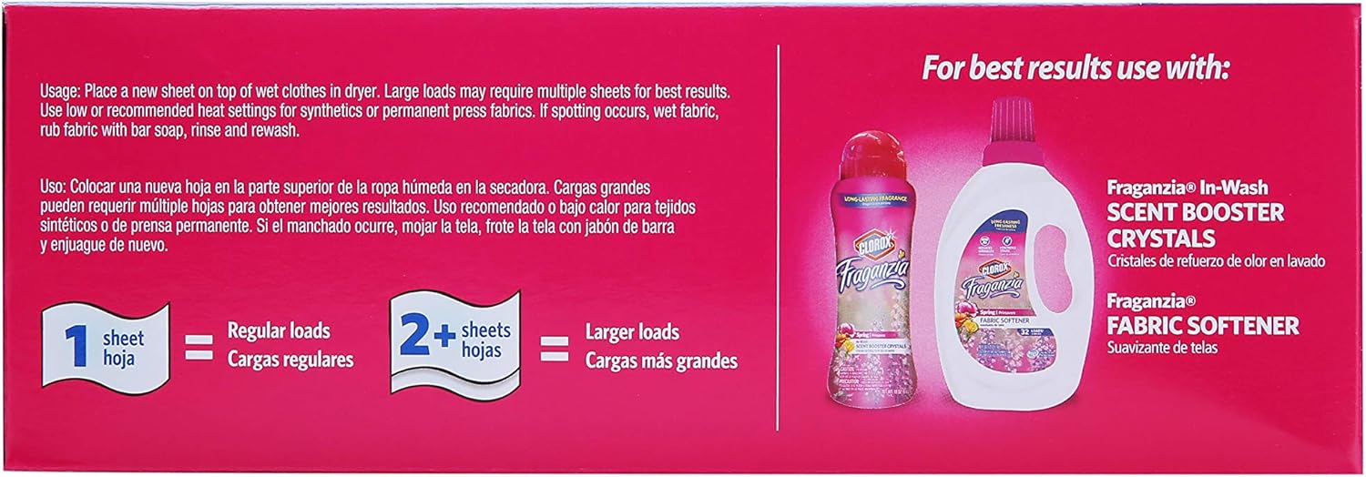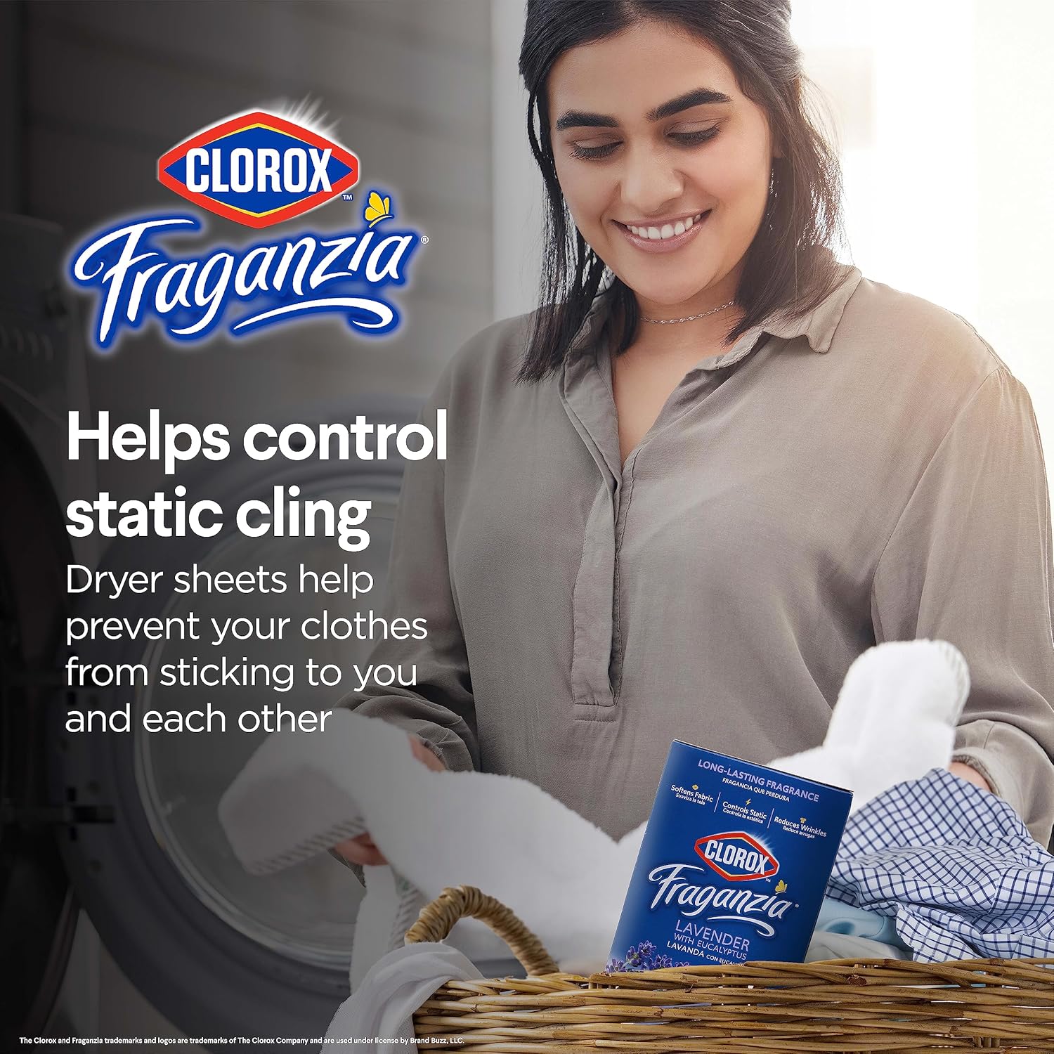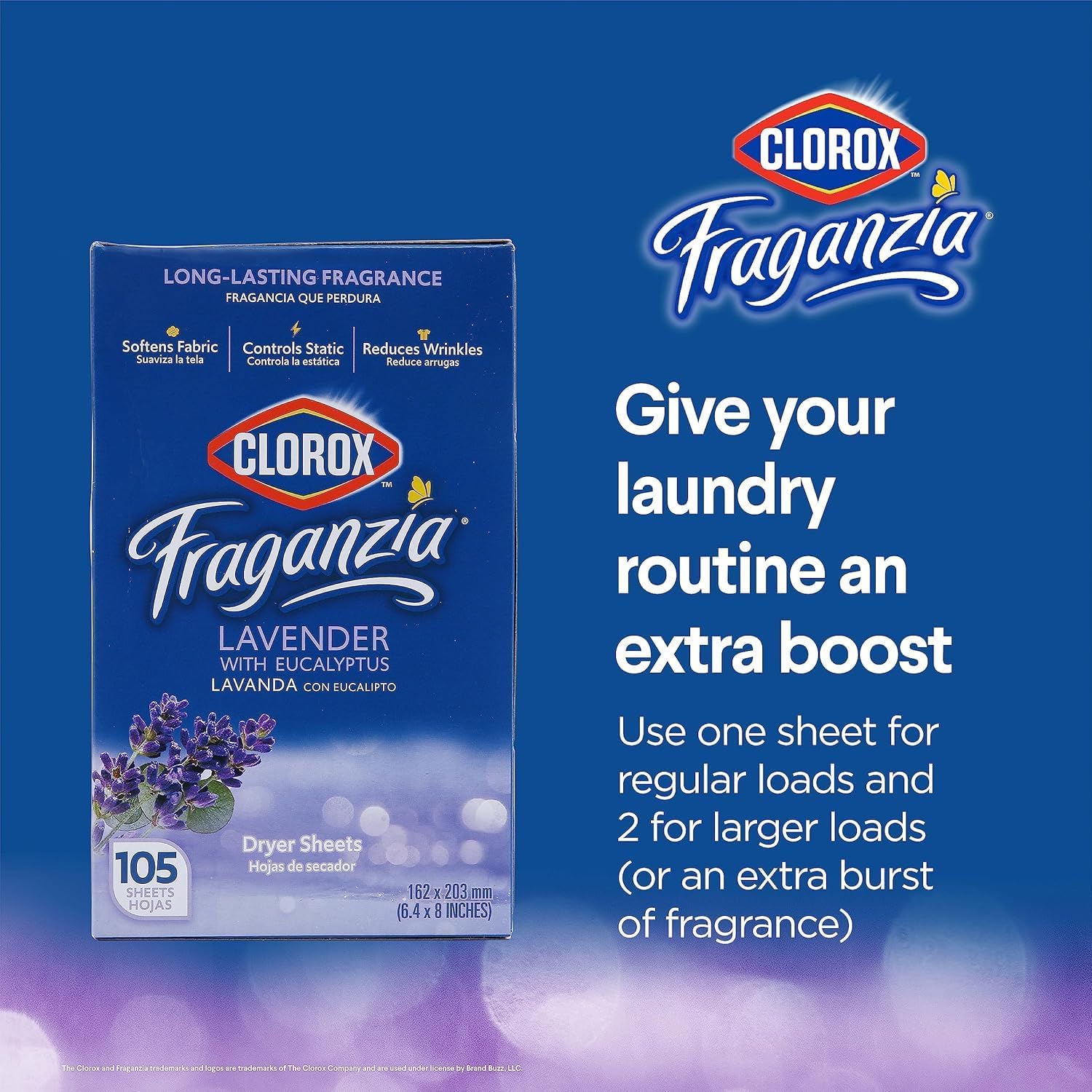 "Clorox Fraganzia Fabric Softener Dryer Sheets are scented laundry dryer sheets made to soften fabrics while helping reduce static cling and wrinkles. Add sheets to the dryer to leave clothes and towels with a Lavender with Eucalyptus scent after each load. Each box includes 105 sheets.Made for households that want a simple way to keep laundry feeling comfortable and smelling fresh, including everyday clothing, sheets, and towels. Lavender fragrance helps refresh gym wear and stored linens that can pick up stale odors. Works with common fabric blends.Use during drying: place 1 sheet on top of wet laundry for small loads, 2 for medium loads, or 3 for large loads, then start the cycle in standard or high-efficiency dryers. Afterward, reuse a sheet in drawers, closets, or shoes to add light fragrance around the house."