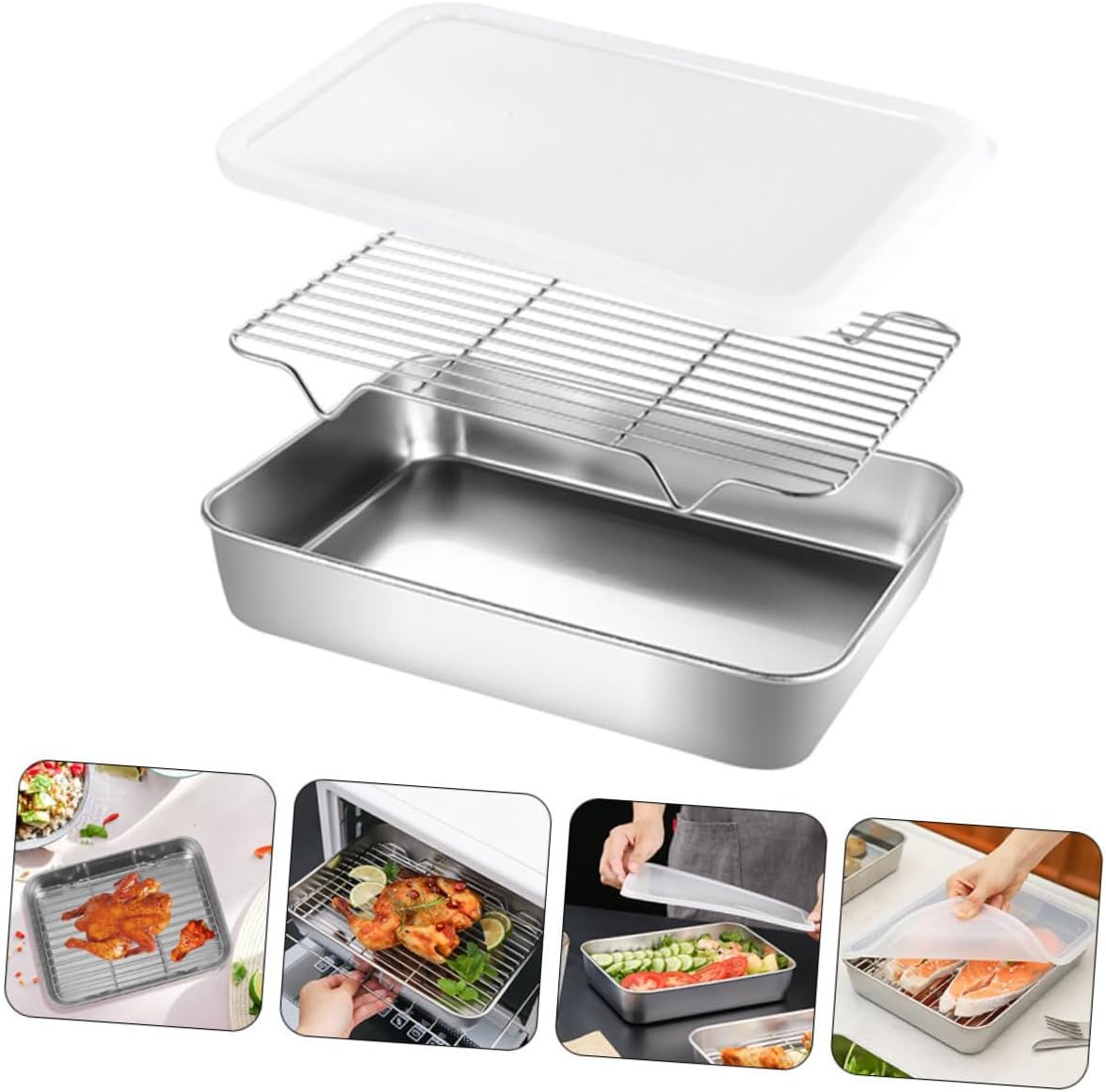 Package List 1 1 x stainless steel rack 1 x lid Characteristics -Material:Stainless steel grill plate with mesh rack -Size:23.00X17.00X5.00cm/9.04X6.68X1.97in baking tray for oven -Color:Silver fruit storage plate - for baking, food roasting, such as chicken, meat, fish, beef, vegetables and so on oven tray. - The set includes a pan, a mesh rack, and a lid, providing versatile functionality for food preparation, storage, filtering oil, and even grilling baking tray with rack. - The baking tray is made of stainless steel materials, can use it and eat it at ease stainless steel grill - for baked goods, meats, breads, cookies, and other desserts, and has a wide application baking pan. - The baking plate is easy to clean, also can put in dishwasher, which can save time and labor baking pan for oven.Goods Descriptionbbq tray This is a baking plate with a cooling rack, made of stainless steel, sturdy and , and can be used for a long time.baking rack Cooling rack, versatile rack is for cooling baked goods and drying cookies.stainless steel grill plate The cooling rack can help cool baked goods such as cakes and biscuits.kitchen supply Non-stick design, more convenient to use