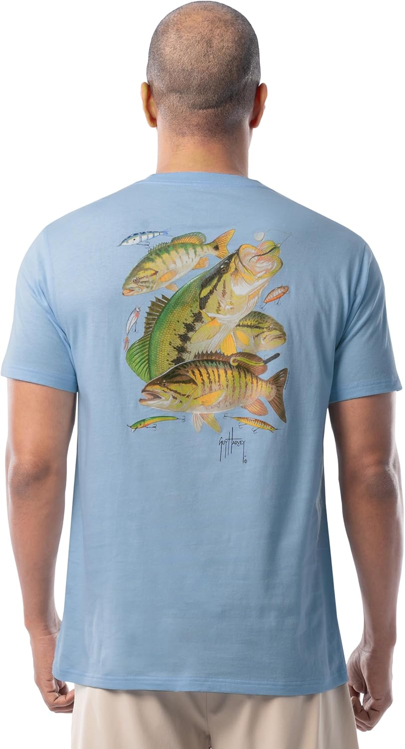 Experience comfort and coastal style with the Guy Harvey Men's Lightweight Cotton Graphic T-Shirt, designed for outdoor enthusiasts, anglers, and anyone who appreciates bold marine and freshwater artwork. This premium short sleeve crew neck tee features iconic full-back graphics by world-renowned marine artist Guy Harvey, showcasing detailed depictions of marlin, bass, crabs, and other aquatic life. Whether you're casting off on the boat, relaxing at the beach, or heading out for a casual day in town, this tee offers lightweight breathability and effortless style. Crafted from 100% soft cotton or a cotton/polyester blend for Heather styles, this shirt is garment-washed with a durable silicone finish that enhances comfort and preserves the shape and color wear after wear. Available in a variety of rich coastal colors and men's sizes S-XXXL, it’s a versatile addition to any fishing or casual wardrobe. Perfect for saltwater and freshwater anglers, boaters, beachgoers, or anyone who lives the outdoor lifestyle, this shirt makes a great gift for Father's Day, birthdays, or holidays. Pair it with your favorite shorts, board shorts, or jeans for a laid-back look that celebrates the spirit of the sea and freshwater adventures.