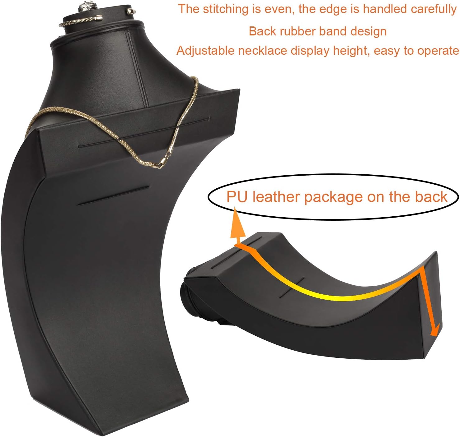 This PU Leather jewelry bust display Holder is your best choice for perfect display in commercial exhibitions or storefronts. It can beautifully and amazingly display all kinds of necklaces, bracelets, rings, earrings you like. You can also use the display in your home to keep your valued necklaces organized in one place. Product detailsProduct Name: Jewelry display stand Material: PU Leather Color: Black Suitable for:Desk top,Jewelry Store,shopwindow,Residential Organizer etc. Applied occasion : Necklace display, ring display, bracelet display. Earring displa, jewelry organize etc. SizeOverall: 9.4*4.7*16.3 inches (L x W x H) Include packaging: jewelry bust stand x 1 (jewelry not included)