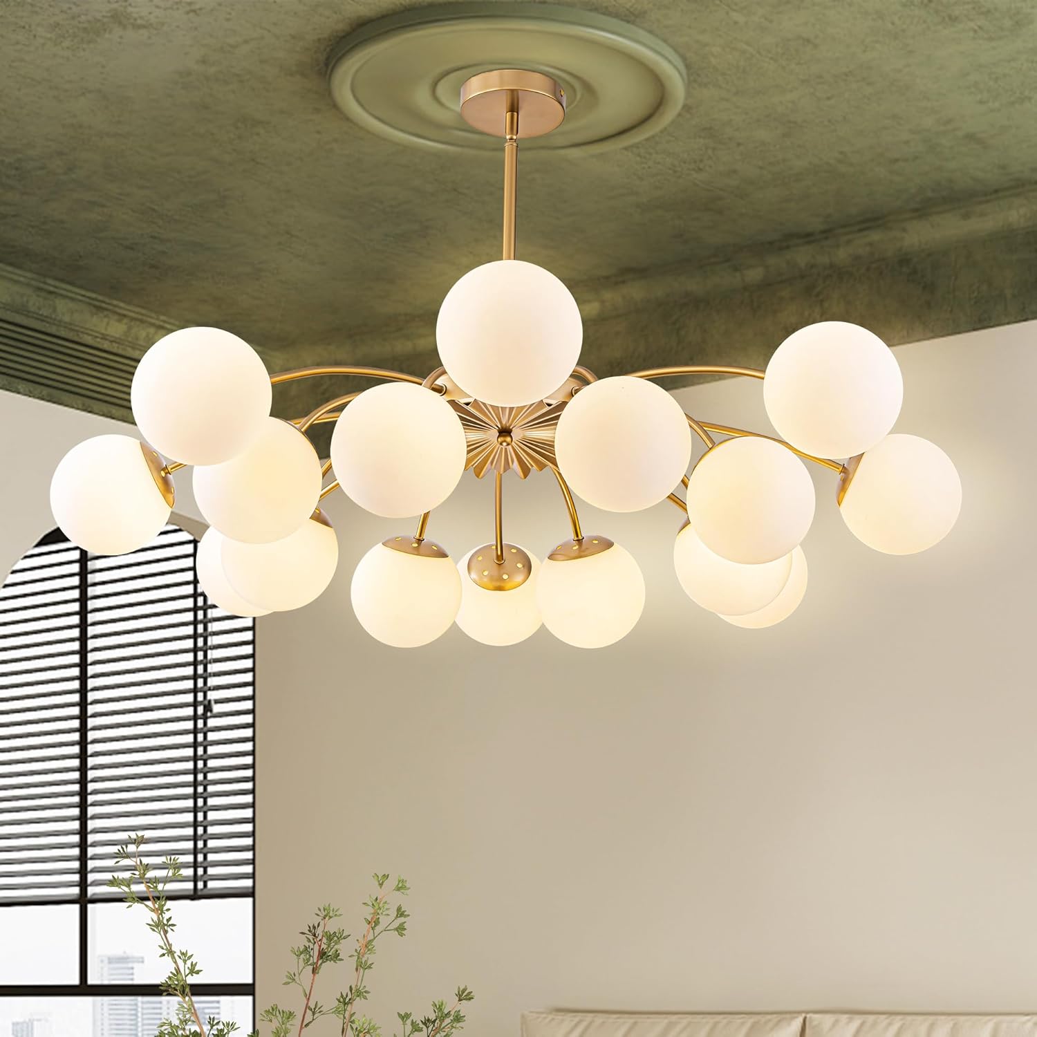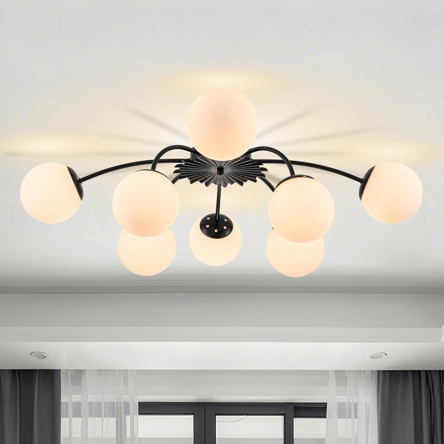 An opulent fusion of classic Sputnik and elegant bubble design, this 8-light semi-flush chandelier features gracefully curved arms cascading from the back of a medal-like base to support alluring milky white glass globes, like a beautiful blossom firework. Warm cozy lighting sweeps down to your space when we turn on this glass globe sputnik chandelier, flowing through frosted glass bubbles and the luxe brass frame with elegance. Perfect to add artful charm and sophisticated beauty to your home decor, this 8-ight opal glass bubble chandelier funky chandelier is the best enhancement to a living room, dining room, entryway, bedroom, orlobby.