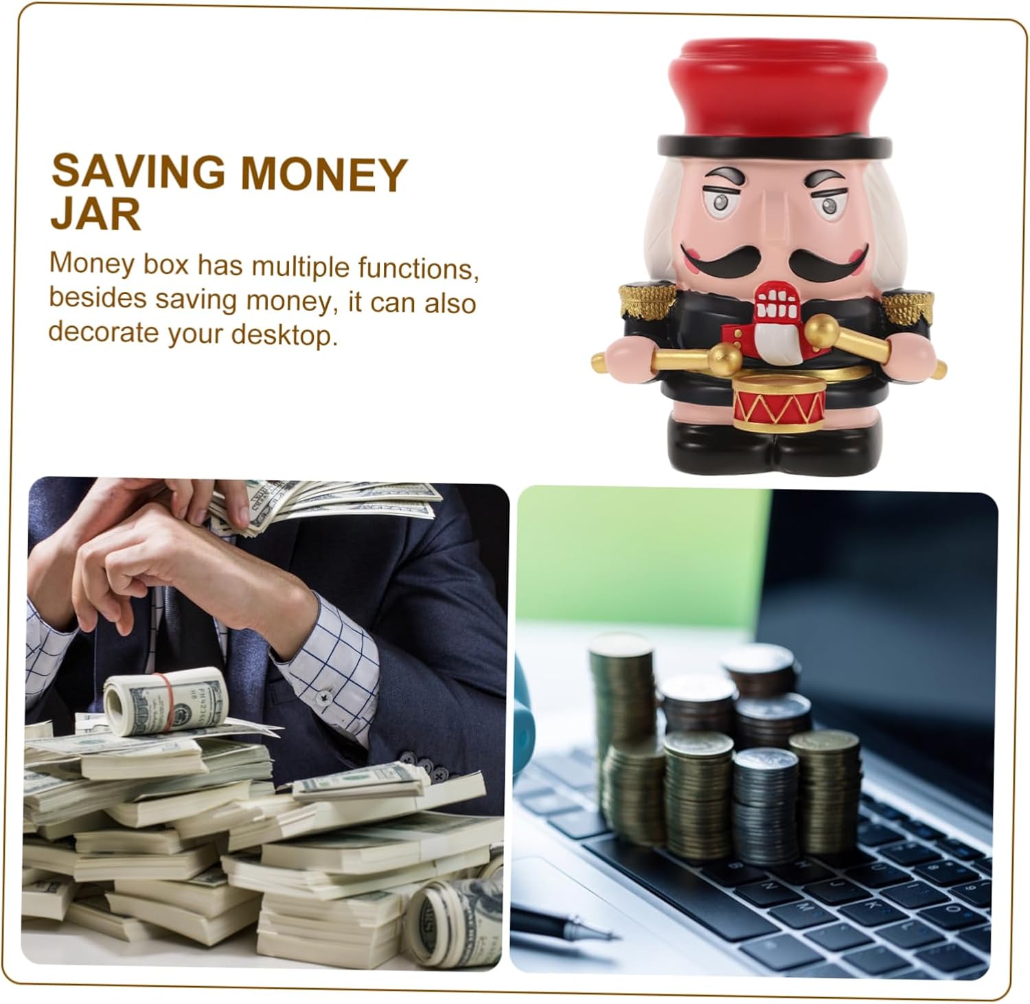 DescriptionThe Nutcracker Piggy Bank is a decorative saving pot that doubles as a fun desktop saving jar. Its charming British soldier design adds a touch of whimsy to any room, making it a great piece for home decor. Kids can easily drop their coins into the slot, and the removable bottom stopper ensures they can access their savings whenever needed. It's a delightful make saving money enjoyable.Features-Color:Black-Material:Resin-Size:17.00X14.00X13.00cm/6.68X5.50X5.11in-Charming nutcracker design: the delightful nutcracker shape makes saving money an exciting and enjoyable activity for children, encouraging regular saving habits-Userfriendly: the decorative piggy bank's design allows for easy deposits and withdrawals, making it simple for kids to manage their savings independently-Decorative: this piggy jar also serves as a decorative british soldier figure, adding a playful and stylish touch to any child's room- and safe: crafted from resin, materials, this cartoon piggy bank is safe for children to use and built to last through years of saving-Teaching value: by using this piggy bank, children learn the importance of saving and gain early financial literacy skills