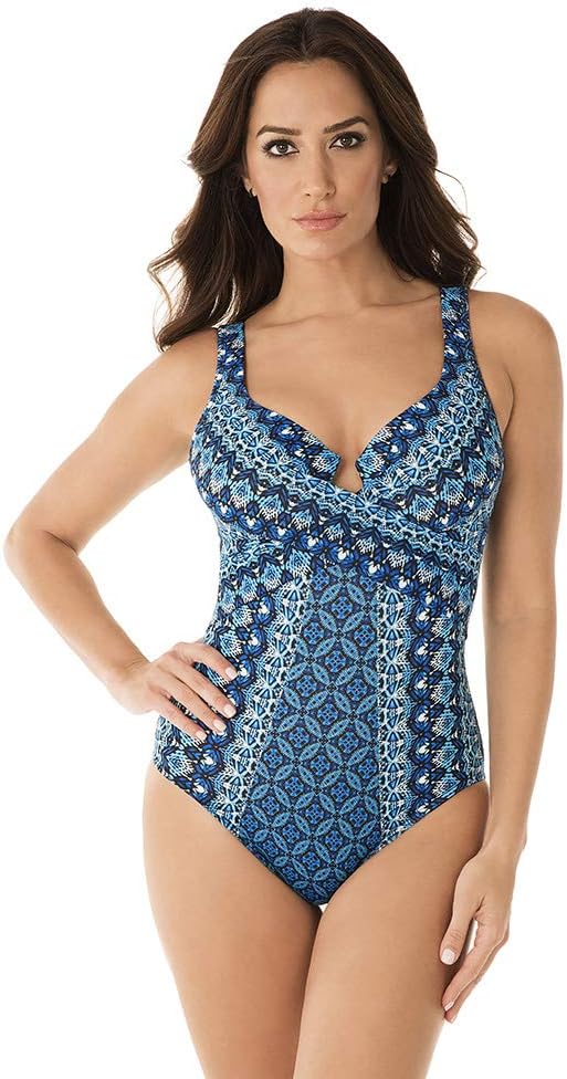 Look 10 lbs. lighter in 10 seconds® with Miraclesuit Miratex fabric provides allover body control, shapes and slims Molded foam cup with underwire, padded straps Cleverly draped fabric conceals tummy