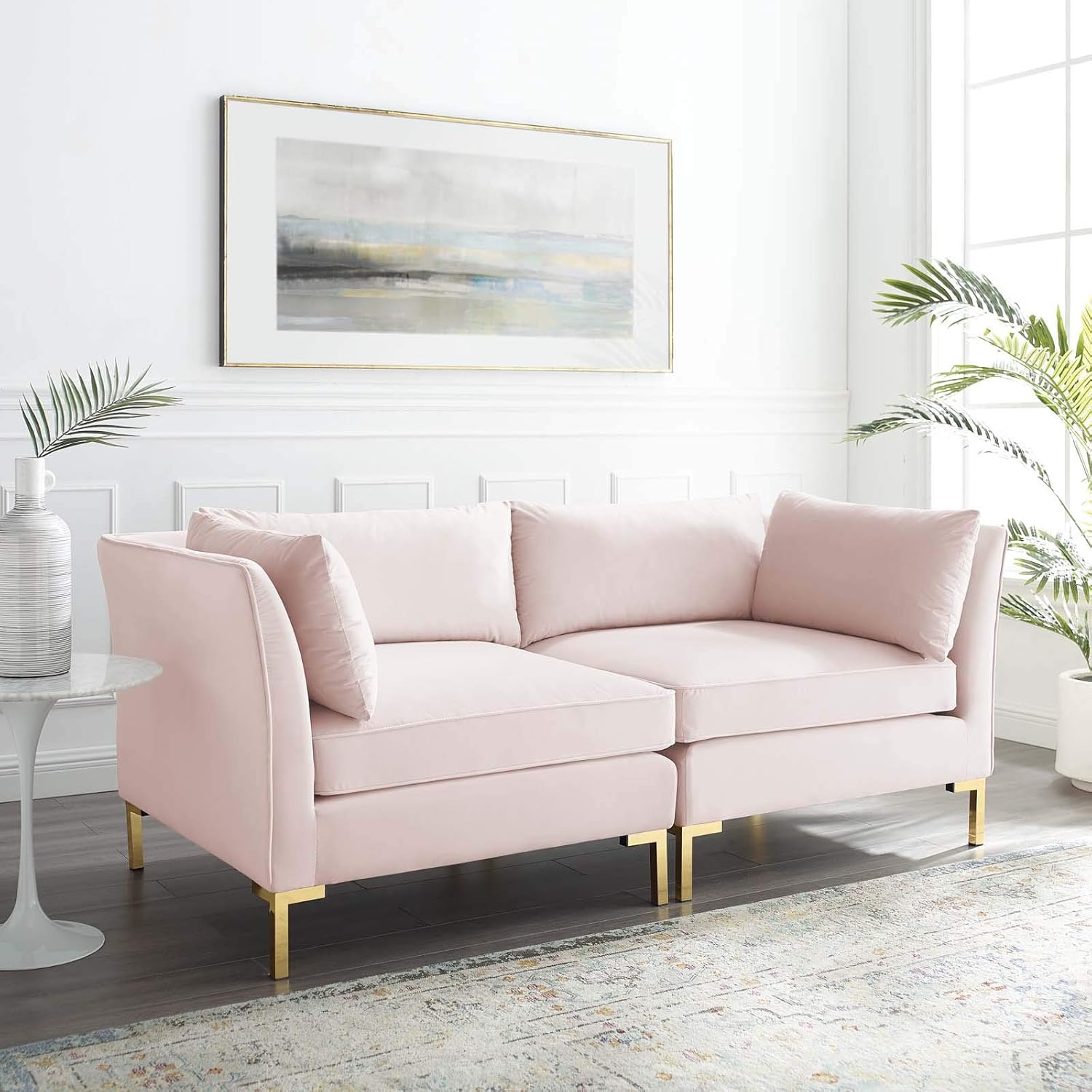 Introduce vintage modern and glam deco styles to your living space with the Ardent Performance Velvet Loveseat. With luxe velvety texture and classic French piping, Ardent refreshes homes, apartments, and office spaces. This sectional sofa collection that allows for a variety of configurations to suit any living room, bedroom, office space, or lounge area while hidden connection buckles offer a secure fit. Covered in stain-resistant performance velvet, this two-seater sofa features dense foam padding and a sinuous spring support system for a premium seating experience. The velvet loveseat sits on gold metal legs with non-marking foot caps to protect your flooring. Weight Capacity for Each Sectional Sofa Piece: 440 lbs.