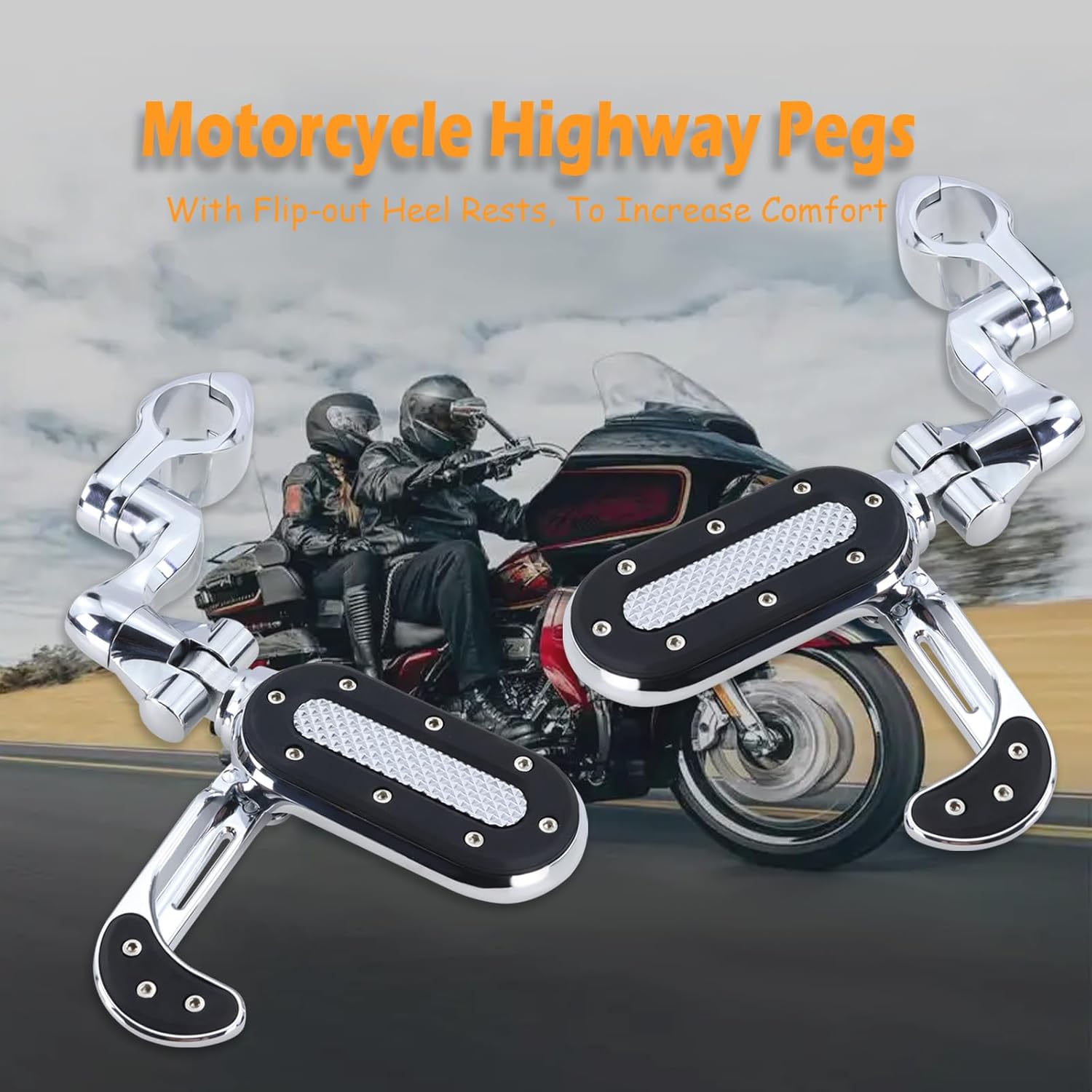 Motorcycle Highway Pegs with Flip-out Heel RestsCompatible ModelsCompatible with Harley Electra Glide Ultra Limited Road Glide Street Glide Road King Dyna Sportster Softail with 1.25" Engine Guard Bar (Note: not fit the bike with Lower Fairing)Flip-out Heel RestsAdd a place to stretch your legs out and tilt your feet outward for added comfort. AdjustabilityHighway pegs can be adjusted 360° to desired angles under the assembly and rotation of several small parts, 270° Adjustable allows to up or down adjustment,90° foldable allows to retract the footpeg.Sutiable for both short and tall riders.Premium QualityMade of 304 stainless steel, it is more stable and reliable than other zinc alloy materials. It can prevent screw and thread wear, is sturdy and durable, and is not easy to break.Non-SlipThe surface of Motorcycle Highway Pegs features a textured design that provides excellent grip, preventing boots from slipping and making driving safer.