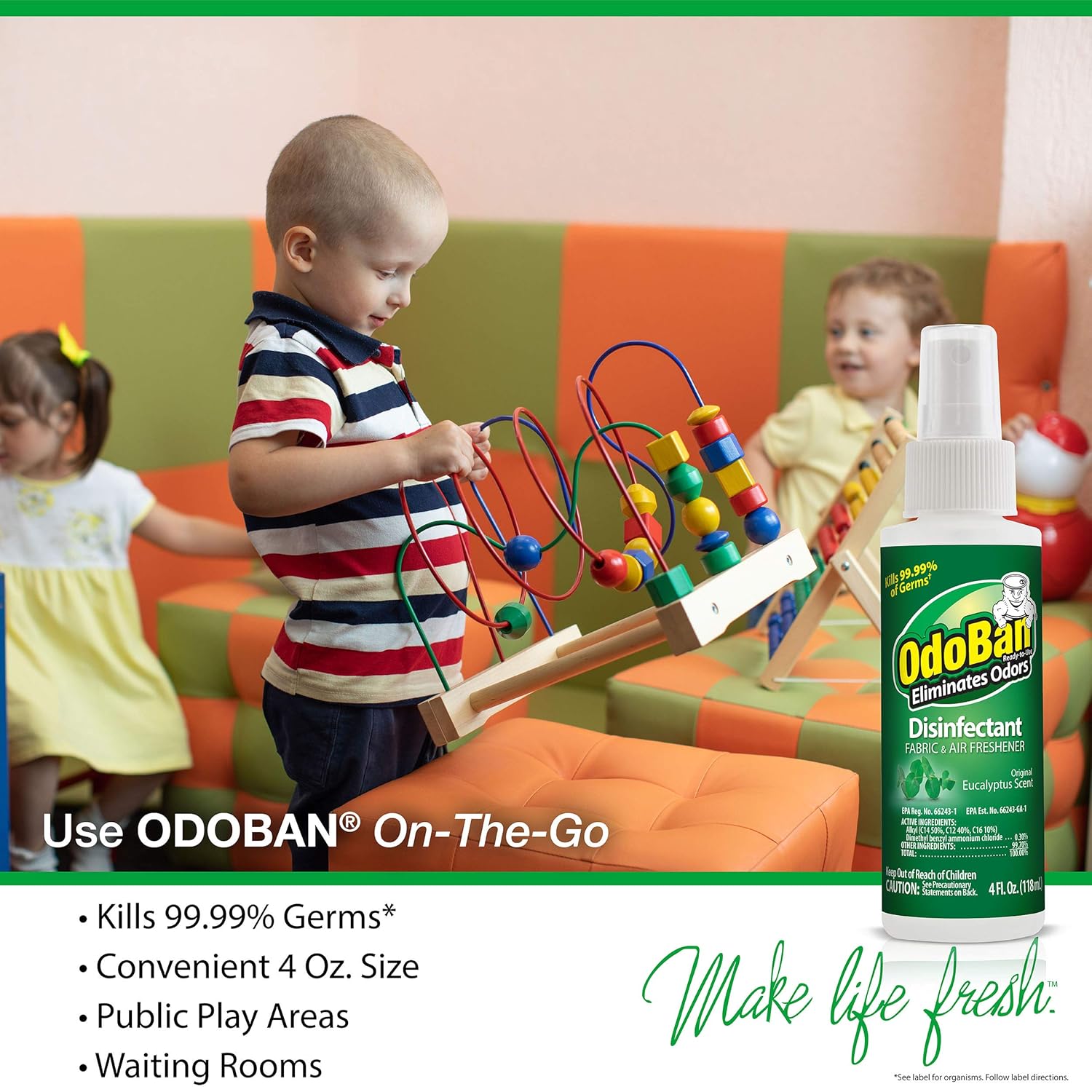 OdoBan Ready-to-Use multi-purpose formula spray does the job of many products in one. Our travel size-spray is always convenient and the one gallon bottle backup is also great to have on hand for refills when you need them. It's an effective cleaner and sanitizer that leaves no residue, and works effortlessly to disinfect hard, nonporous household surfaces. Kills the Human Coronavirus in 60 seconds when used according to disinfection directions on hard, nonporous surfaces; meets the criteria for inclusion on EPA List N (EPA Reg. No 66243-2). It's also an effective eliminator of harsh aromas and stenches including pet urine aftermath in carpet, upholstery, and more. It can even stand up to the smell of smoke and can be used in sinks, tubs, and for mopping floors and washing walls. Not only is it an exceptional cleaner, but it's a great air freshener and will remove harsh smells from any room. It's also a great way to refresh laundry and fabrics. OdoBan products can be used in both households and business facilities of all types including schools and day cares, hospitals, nursing homes, in ambulances, buses, and trains, in airplanes and taxis, in restaurants and cafeterias; pretty much any place where people commune. When used as directed, OdoBan is safe for use on washable surfaces, including sealed natural stone, stainless steel, ceramic, tile, Formica, fiberglass, rubber, vinyl, terrazzo, and plastic. Safe for use on sealed natural stone countertops and surfaces, like granite, quartz, marble, ceramic, and soapstone. Make Life Fresh with OdoBan.