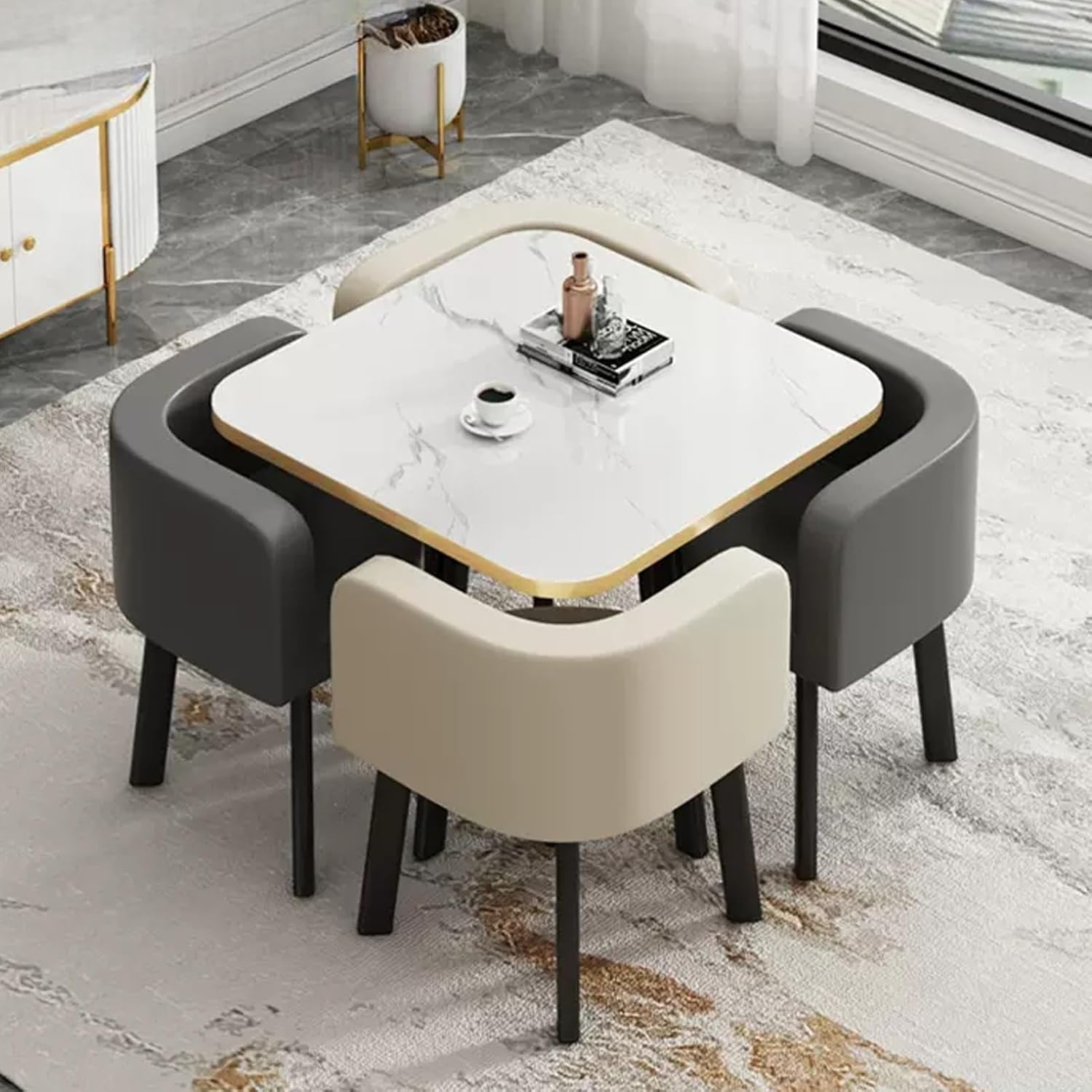 Rounded corner anti-collision design, the corners of the table are curved and carefully polished to reduce the damage caused by collisions in life.The interior is filled with high-density sponge, which is soft, comfortable and has strong resilience.The non-slip mat design prevents friction from damaging the floor, making it non-slip and quiet.Modern simple dining table home dining table apartment round table leisure negotiation reception table and chair combination small round tableProduct Parameters:Product Name: Table and chair combinationFeatures: Simple,generous,space savingColor: Corresponding reference pictureStyle: simple and modernBracket structure Material: MetalTable Shape: Round/SquareDesk top Material: Wood-based panelTable top diameter: 31.5"/80cmTable top thickness: 25mmTable loading: 300KGChairs material: PU leatherTotal chair height: 75cm/29.5inSeat loading: 100KGApplicable number: 4 peoplePacking method: assemblyPacking list:1*table,4*chairsWarm Tips:1. Size Description: The product is completely measured by hand and may have an error of 1-3 cm. Please refer to the actual items received.2. Picture description: The product is real. Due to problems with light, angle, display, etc., there may be slight chromatic aberration, please forgive me.