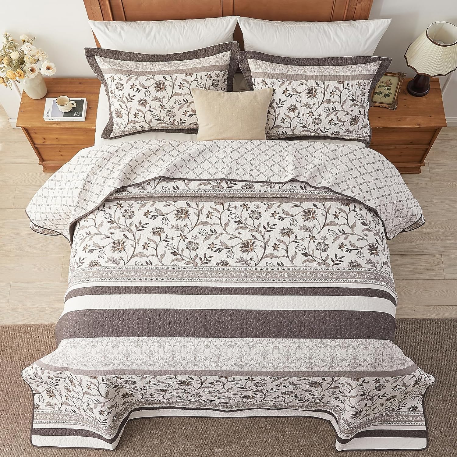 Refresh your bedroom with this serene, striped, oversized quilt set featuring a botanical pattern. Crafted from 100% breathable cotton, this 3 piece set is pre-washed for softness and machine-washable for daily convenience. It's a versatile and stylish choice for contemporary, farmhouse, or minimalist homes.