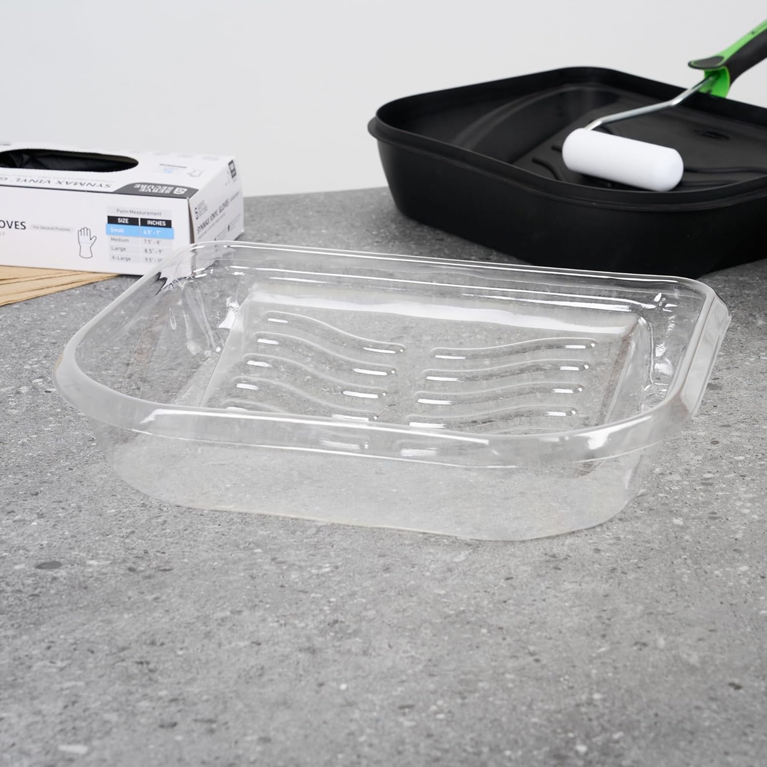 Our Handy Tek Clear Plastic Paint Tray Liners make painting easier, cleaner, and more efficient than ever before. These painting tray inserts are designed to fit snugly into the Handy Tek paint tray (SKU: RWT2136G), ensuring a secure fit that prevents slipping or shifting during use. These tray liners are well-suited for facility maintenance teams working across multiple locations. Made from tear-resistant material, these paint tray liners hold paint securely without leaking or tearing, even during heavy use. To enhance stability, each paint liner insert includes two snaps at each end to keep it in place. As disposable paint roller tray liners, they simplify cleanup, just remove and toss after use to save time and reduce mess. Measuring 13.98 inches in length by 11.22 inches in width by 2.95 inches in height, these paint liners boast a 5-quart capacity, making them ideal for a variety of painting tasks. Sold in a 120 count box.