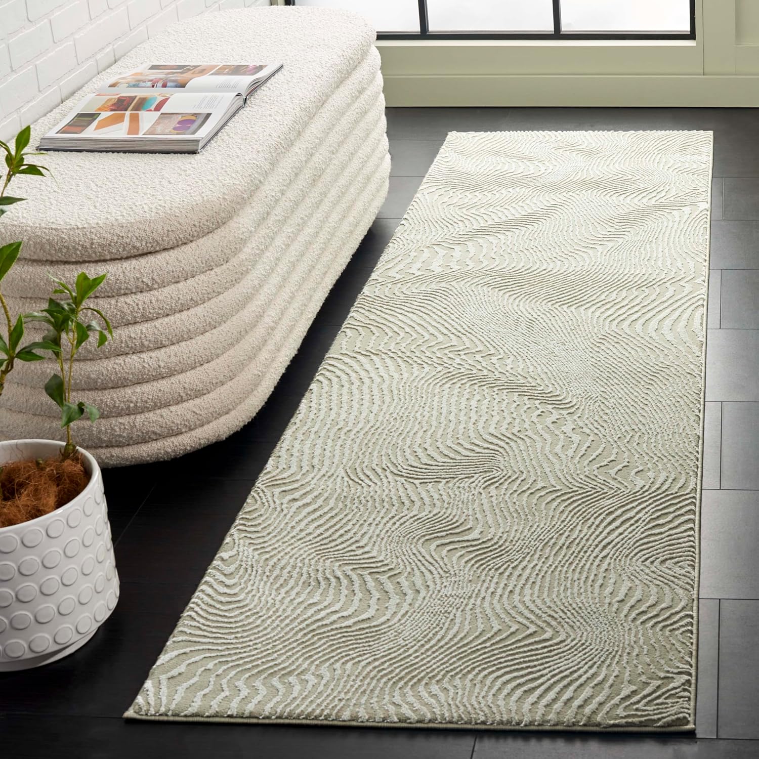 Understated elegance encapsulates the style of the Revive Collection of area rugs by SAFAVIEH. With neutral colors spanning across a textured striped background, these rugs add subtle dimension to casual, transitional, and contemporary décors alike. Featuring a 100% polyester pile, these rugs are soft to the touch and virtually non-shedding for easy care. Rug sizes may vary slightly.