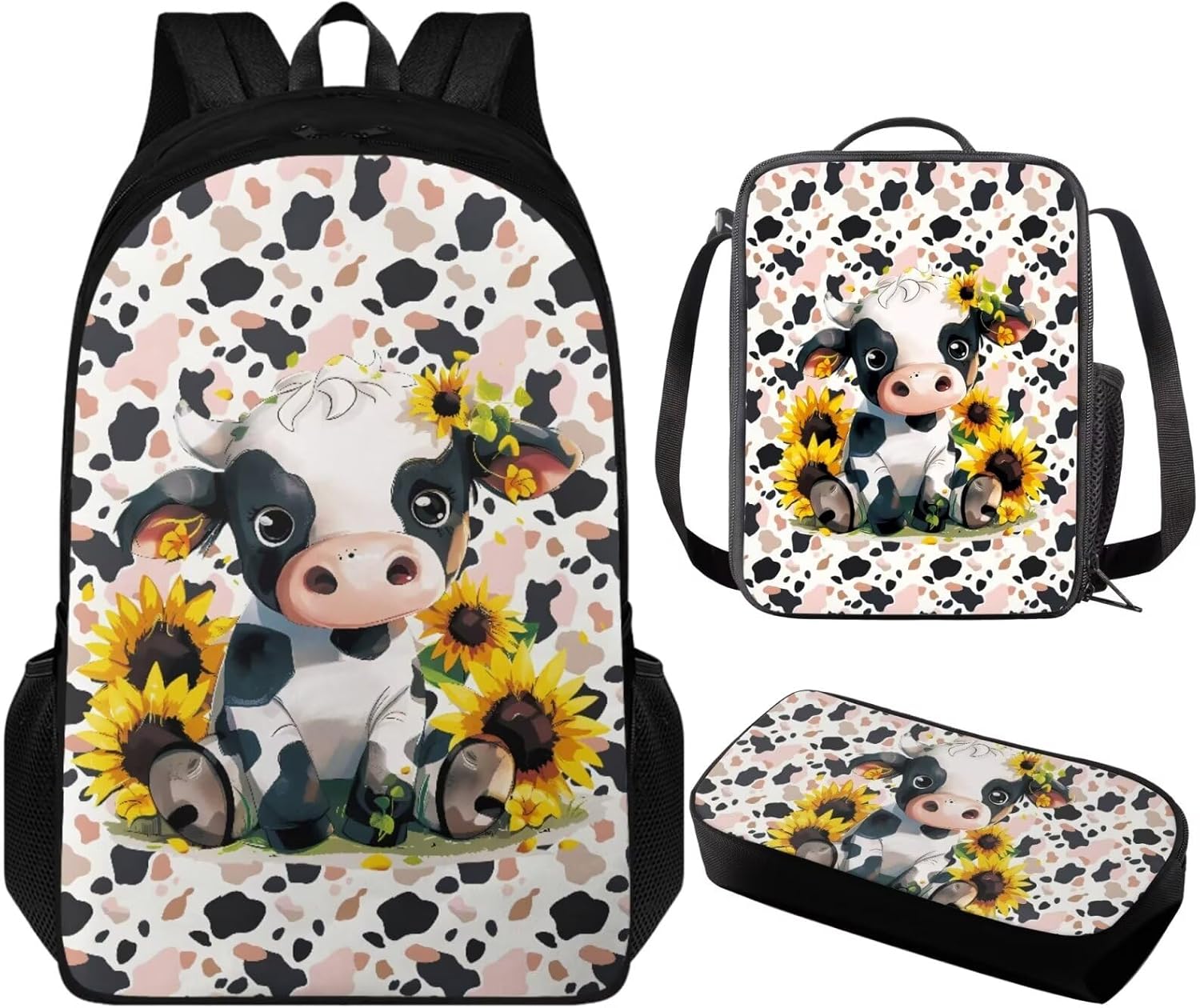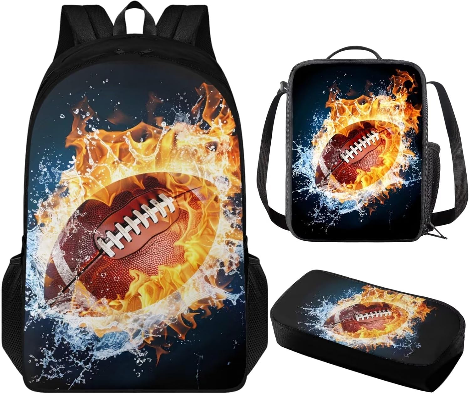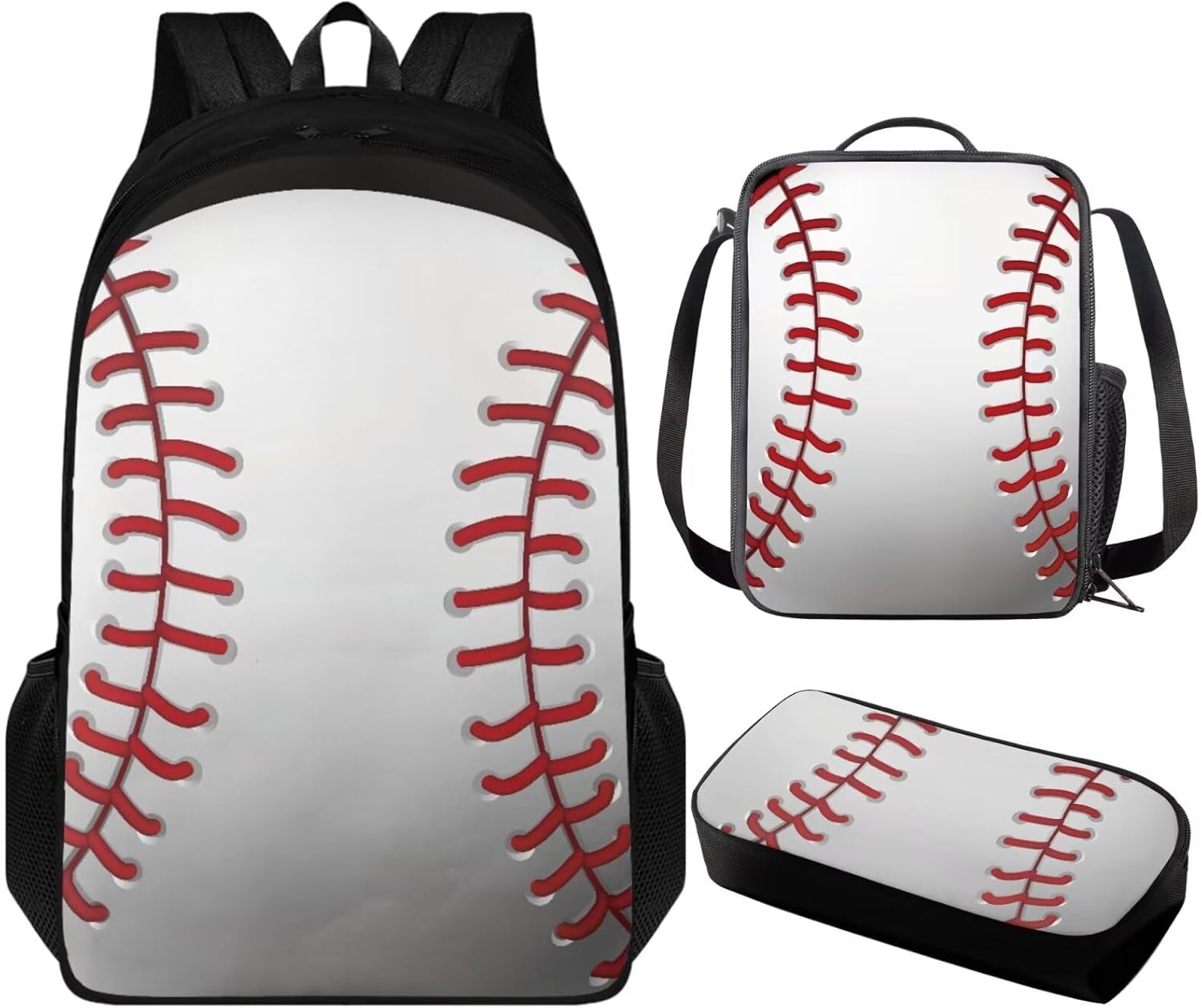 3 Pack Backpack with Lunch Box and Pencil Case for Girls Boys Teens Children School Bag Set for Elementary Middle High school Student Backpack: 17.3” x 11” x 5.5”. The school bag with adjustable shoulder straps and double zipper, enough space to hold laptop, cellphone, iPad, pen, keys, wallet, books, snacks, clothes, umbrella, water bottles and more. Lunch Box: 9” x 7” x 2.7”. Made of polyester material, lining material is EVA + PE cotton, with adjustable shoulder strap, top handle, 1* main compartment, 1 *side mesh pocket. Pencil Bag Case: 8.2” x 3.9” x 1.5”, enough space to keep pens/pencils, eraser, rulers etc. Which is a classic, simple, practical, and beautiful pen bag. Fashion Design: The backpack and lunch box pencil case set we designed has a variety of bright colors and interesting patterns to choose from, which is attractive to both boys and girls. The trendy design adds a touch of fashion to their back-to-school suits, making them the envy of their classmates. 3PCS bookbag set for girls boys with various patterns such as axolotl, horse, trucks, trains, chicken, baseball, basketball, soccer, butterfly, frog, mushroom, dinosaur, cow print, cat, dog, hummingbird, koala, sloth, panda etc.