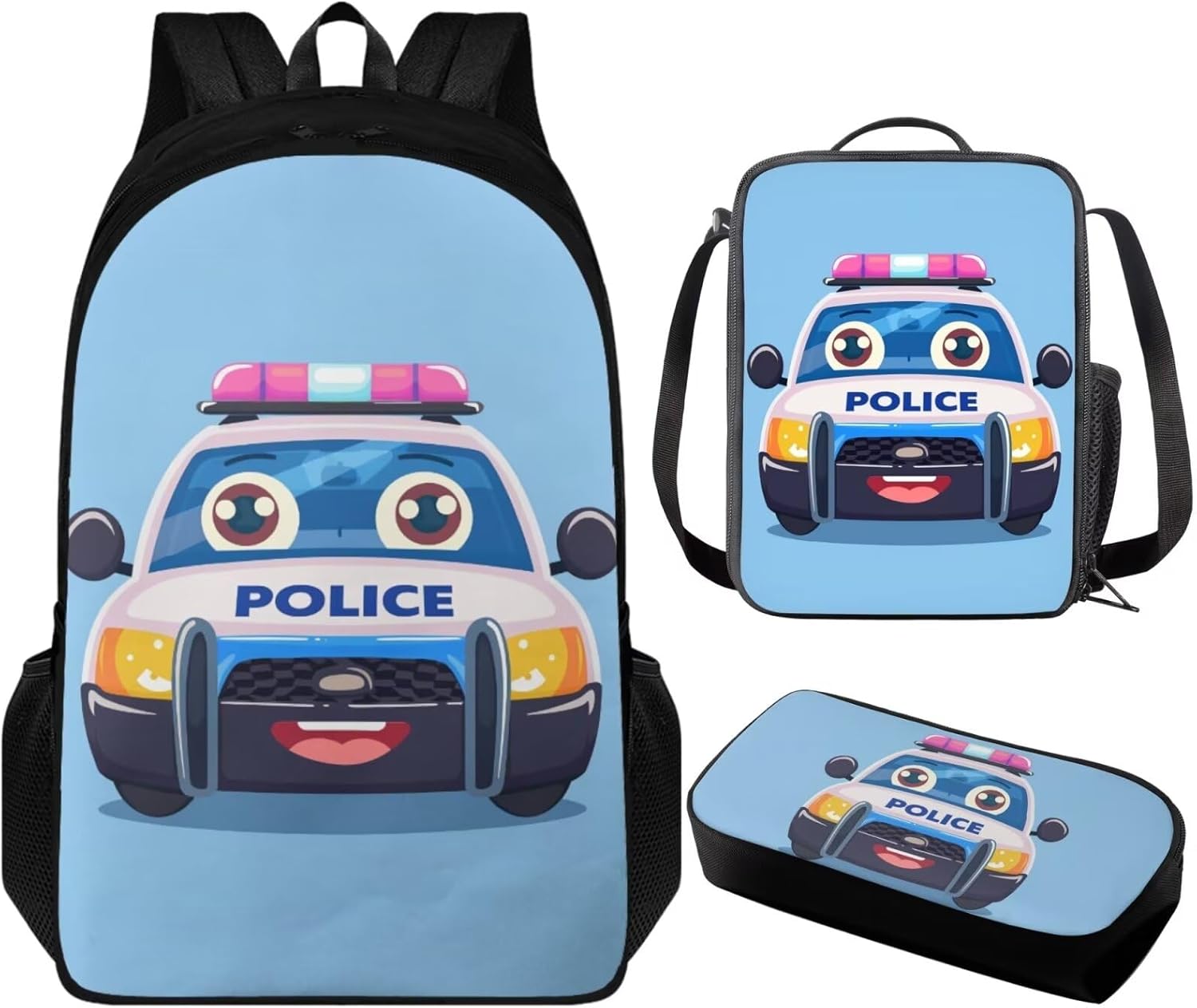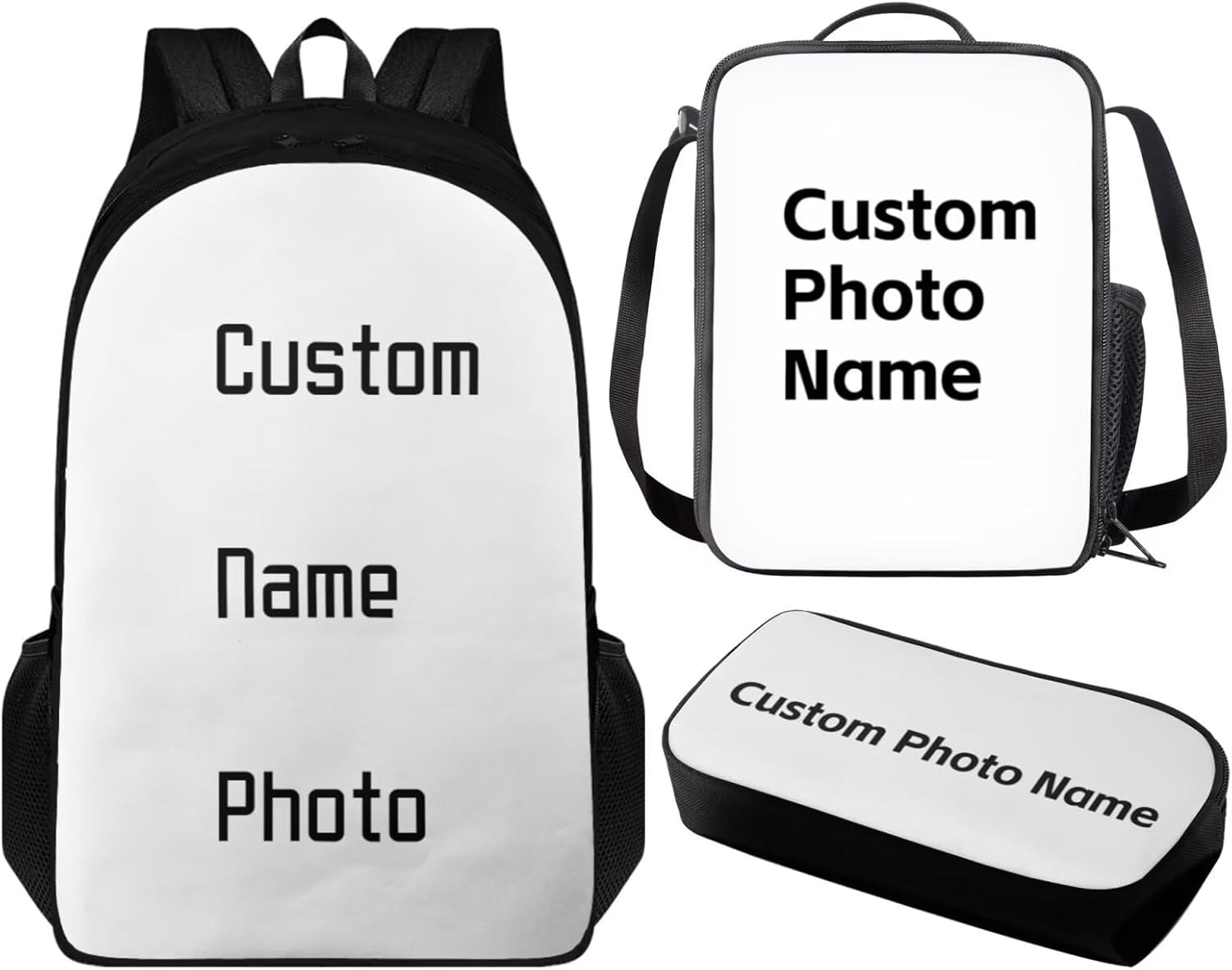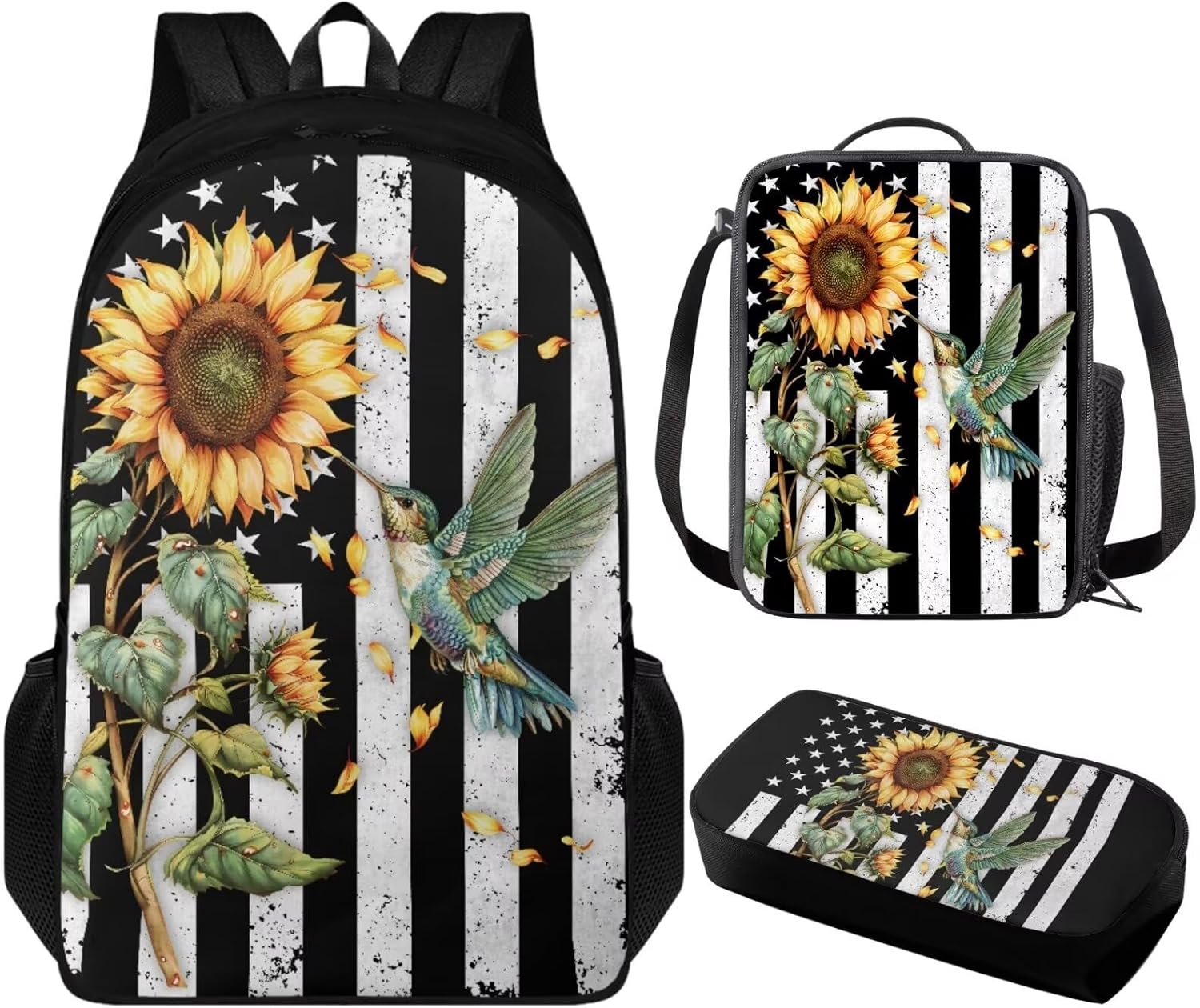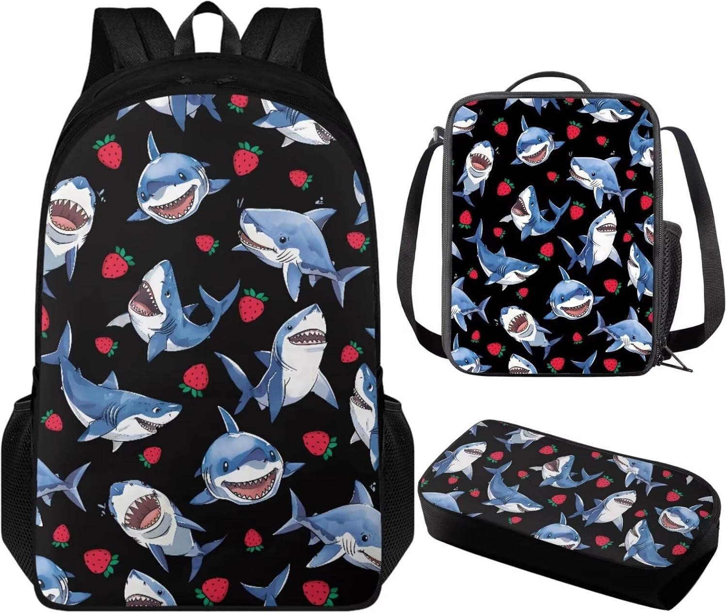 3 Pack Backpack with Lunch Box and Pencil Case for Girls Boys Teens Children School Bag Set for Elementary Middle High school Student Backpack: 17.3” x 11” x 5.5”. The school bag with adjustable shoulder straps and double zipper, enough space to hold laptop, cellphone, iPad, pen, keys, wallet, books, snacks, clothes, umbrella, water bottles and more. Lunch Box: 9” x 7” x 2.7”. Made of polyester material, lining material is EVA + PE cotton, with adjustable shoulder strap, top handle, 1* main compartment, 1 *side mesh pocket. Pencil Bag Case: 8.2” x 3.9” x 1.5”, enough space to keep pens/pencils, eraser, rulers etc. Which is a classic, simple, practical, and beautiful pen bag. Fashion Design: The backpack and lunch box pencil case set we designed has a variety of bright colors and interesting patterns to choose from, which is attractive to both boys and girls. The trendy design adds a touch of fashion to their back-to-school suits, making them the envy of their classmates. 3PCS bookbag set for girls boys with various patterns such as axolotl, horse, trucks, trains, chicken, baseball, basketball, soccer, butterfly, frog, mushroom, dinosaur, cow print, cat, dog, hummingbird, koala, sloth, panda etc.