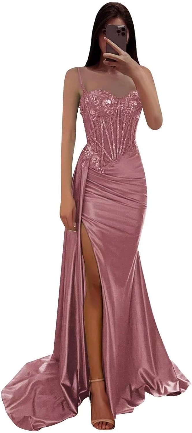 | Fabric Type | Long Satin Spaghetti Straps Lace Appliques Mermaid Prom Dresses 2025 with Slit |