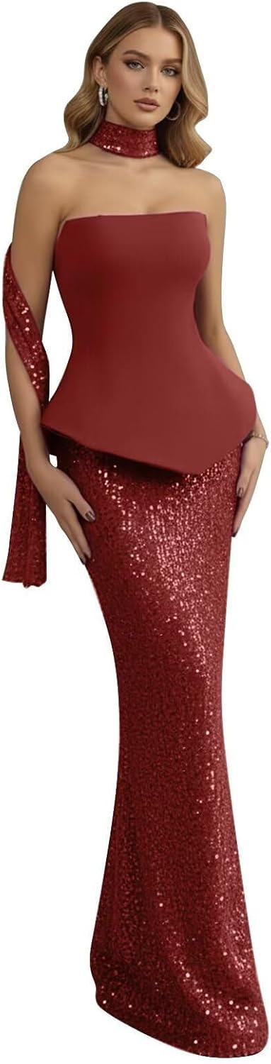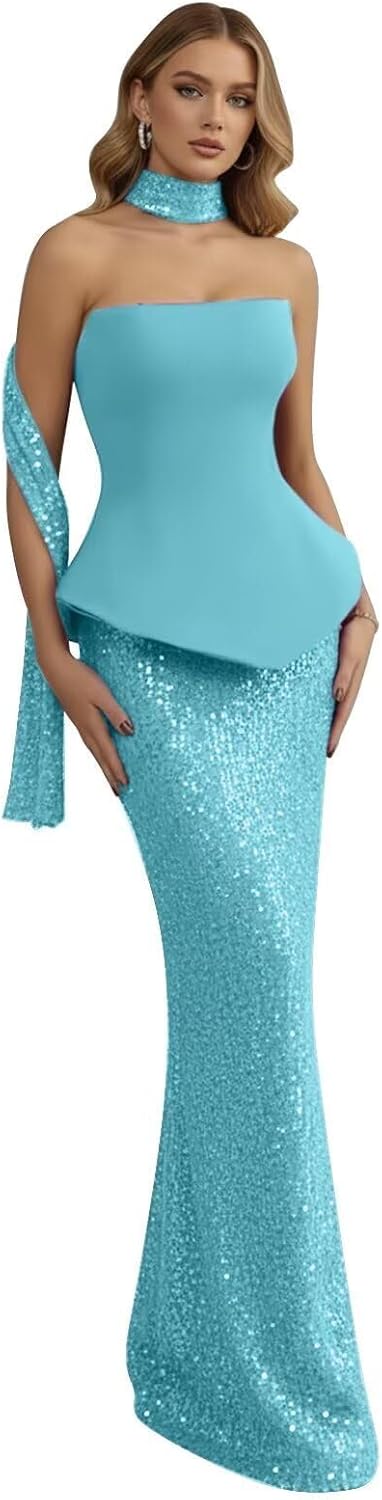 | Embellishment Feature | - 2026 mermaid strapless formal dresses for prom, - Plus size floor length sequin prom dresses, - Sparkly sleeveless formal dresses with built-in bra, - Strapless mermaid prom dresses with scarf, - Tight corset sequin evening gowns with built-in bra |