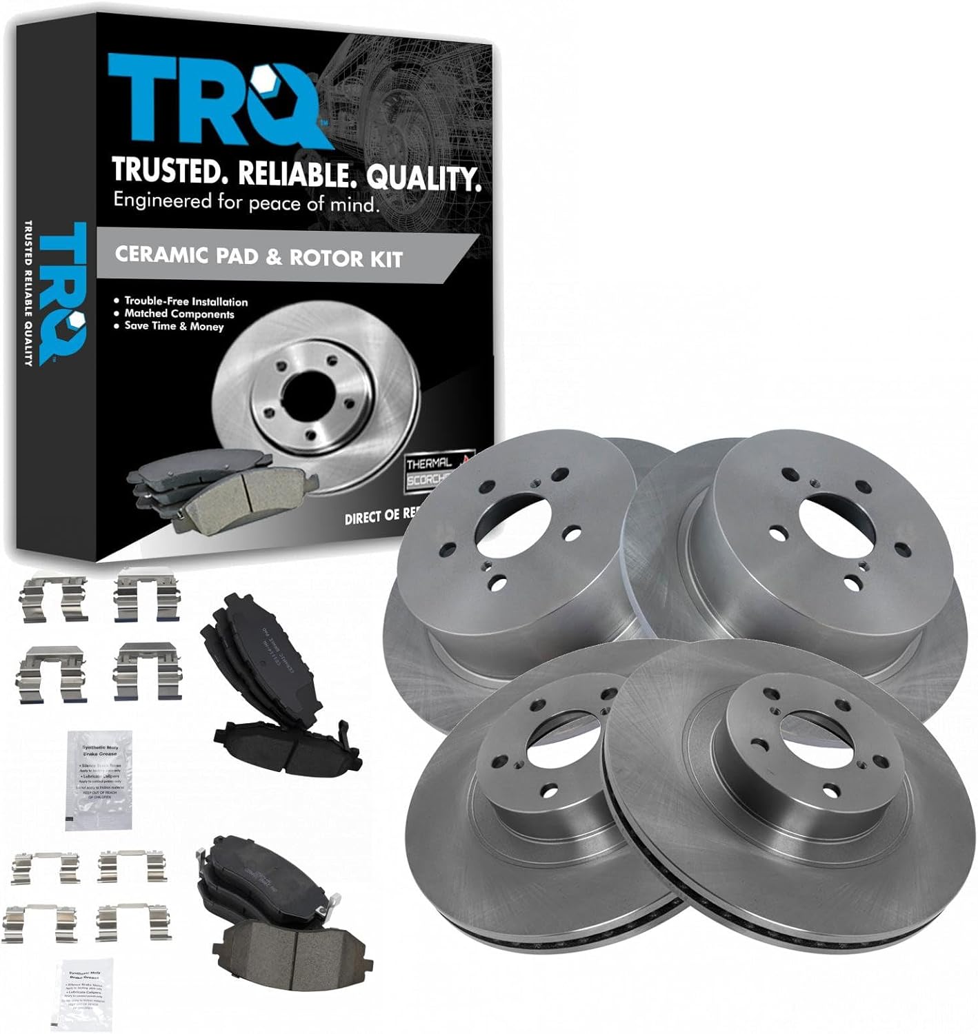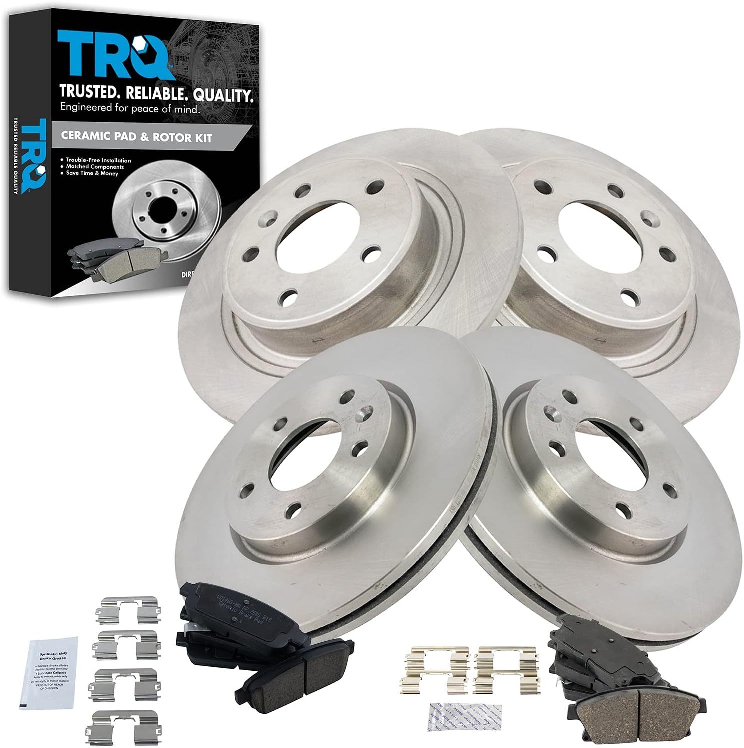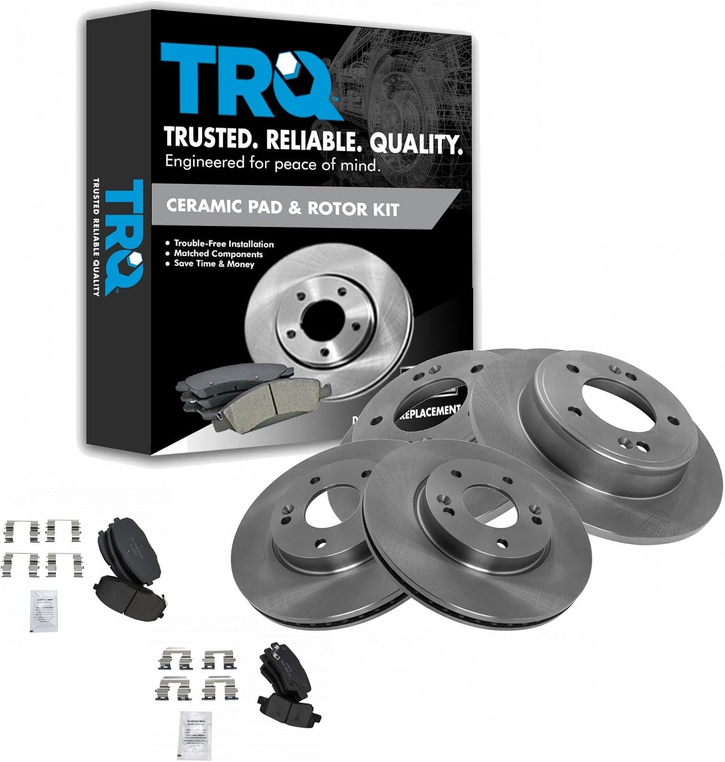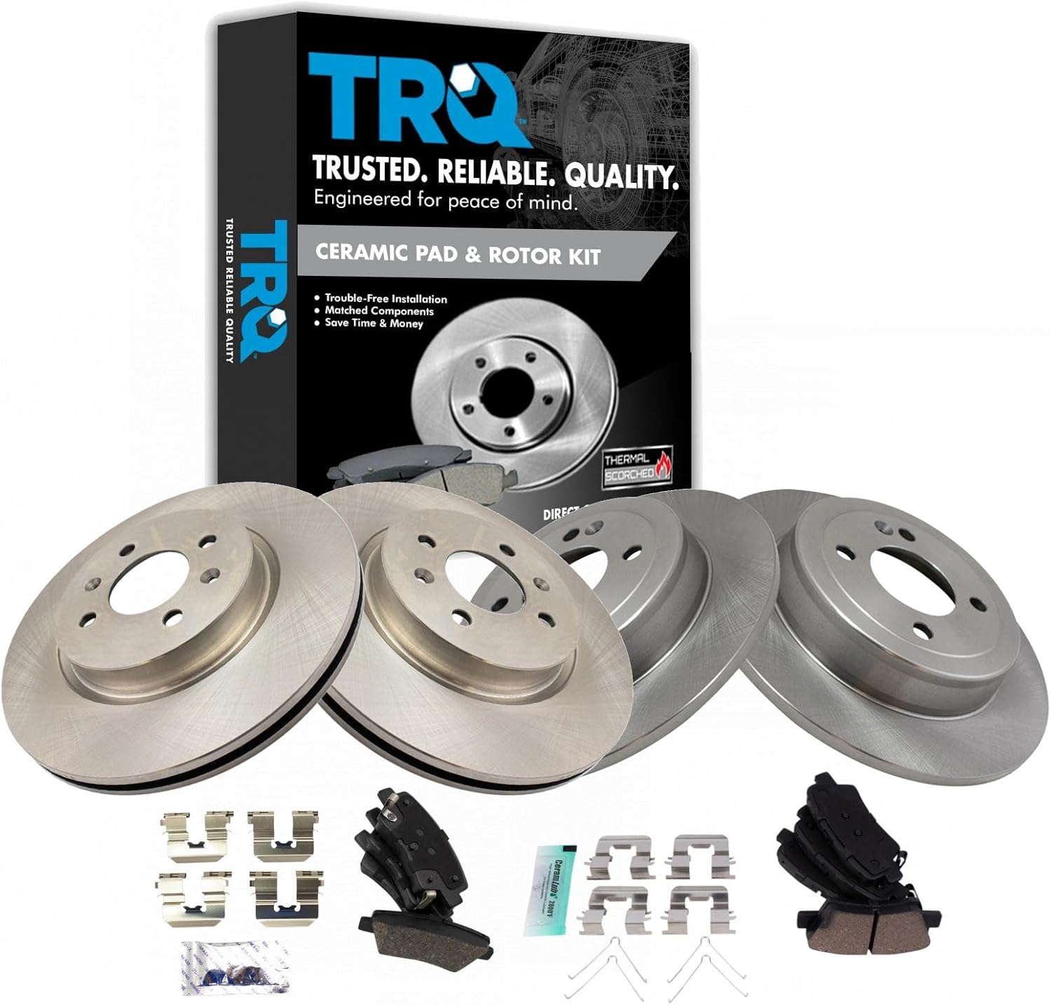 Ceramic Brake Pad & Rotor KitKit Includes(1) Front Ceramic Brake Pad Set(1) Rear Ceramic Brake Pad Set(2) Front Brake Rotors(2) Rear Brake Rotors11.69 in. (297mm) Front Brake Rotor Diameter11.93 in. (303mm) Rear Brake Rotor DiameterFitmentMazda CX-5 2016-18 - Front & Rear 2019-21 - Grand Touring Front & Rear 2019-21 - Sport Front & Rear 2019-21 - Touring Front & Rear 2021 - Carbon Edition Front & RearProduct AttributesFriction Material Composition: CeramicFront Brake Rotor Diameter: 11.69 in. (297mm)Rear Brake Rotor Diameter: 11.93 in. (303mm)Wheel Lug Count: 5 LugBrake Pad Friction Material: CeramicBrake Pad Bonding Type: Premium PosiRear Brake Rotor Venting Type: SolidFront Brake Rotor Venting Type: VentedProduct Features Positive Molded - Less dust resulting in clean wheels G3000 Casting Alloy - Reduced noise and improved wear resistance Application Specific Design - Extended service life, no modificationsItem DetailsTRQ brake kits are designed to restore your brake system to like-new performance. TRQ brake pads are positive molded, thermal scorched, chamfered, and utilize a multi-layer shim for enhanced performance and service life. TRQ rotors have a non-directional finish that reduces the break-in period for new rotors as well as reducing vibrations throughout the rotor’s lifecycle. All products are fit and road-tested in our Massachusetts R&D facility to ensure we deliver on our promise of Trusted Reliable Quality.Reference Numbers120.45094121.45094126.45094SL126.45094SR127.45094L127.45094R128.45094L128.45094R320.4509444771574882600-80076604-8007677112DG77112DL922004RGS981008981008FZN981008P981008R982264982264FZN982264P982264RAX901484BD180544BD180685EBR901196BR901484EHT1623AHEHT1623HEHT1846HGBFT33251GBFT33251AJBR1745EVCK0Y13328ZK0Y13328ZAKAY02648ZKD4533251MA-8054MGD1846CHPRT6212YH566200P