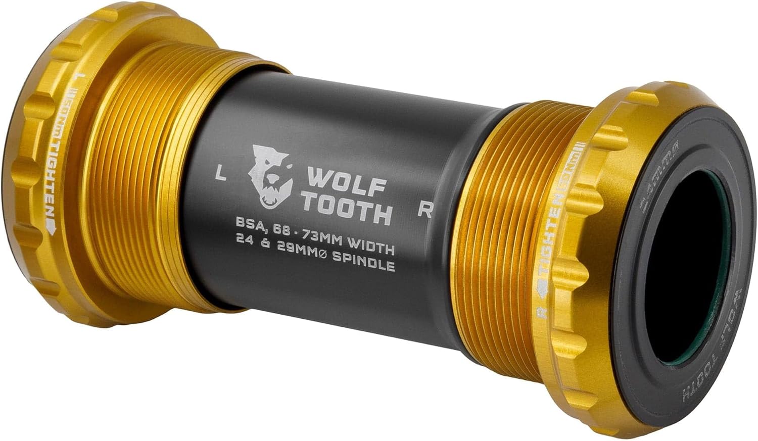 Wolf Tooth BSA Bottom Brackets are engineered to be smooth, durable, lightweight, fast, and user-serviceable. Our ground-up design features custom bearings, seals, bushings, and cups, which eliminate creaking and balance best-in-class weather sealing with optimized bearing radial compression, alignment, and preload for low drag. They're available for 24mm Shimano, 29mm DUB, and 30mm spindle diameters for maximum compatibility, and four colors to match your other Wolf Tooth Color Shop components. The bearings in Wolf Tooth Bottom Brackets feature a custom design. The balls and race are made from a hardened chrome bearing steel. This has a higher surface hardness than stainless, which improves the durability of bearing races and reduces spinning resistance and noise. An ACOSUR ZNA coating has also been applied to the race to provide corrosion resistance that is equal to or better than stainless steel after a 500-hour saltwater test. Bearing material paired with an extensive sealing system and the elimination of metal-on-metal contact means Wolf Tooth Bottom Brackets have superior performance in all conditions. - Compatible with 24, 29 DUB, and 30mm spindle cranksets - Adjustable-width sleeve fits 68mm - 73mm BSA bottom bracket shells - Best-in-class weather sealing protects bearings from water, mud, debris - Custom Polymer spindle bushings eliminate creaking - Installation and removal with standard 44-16 (24mm) and 46-12 (29mm DUB, 30mm) spline tools - Engineered, machined, and assembled at Wolf Tooth HQ in Minnesota, USA Bottom brackets ship with the following shell and spindle spacers: - 2x2.5mm shell spacers - 24mm spindle - 2x 0.5mm, 2x 1mm, 2mm, 3mm, 5mm spindle spacers - 29mm spindle - 2x 0.5mm, 2x 1mm, 3mm, 5mm, 7.5mm spindle spacers - 30mm spindle -2x 0.5mm, 2x 1mm, 2mm, 3mm, 5mm spindle spacers Compatibility - 68, 73 width BSA Bottom Bracket Shells - Included adjustable-width internal sleeve fits 68-73mm width BSA bottom bracket shells - 83mm and 100mm width internal sleeves are also available for purchase