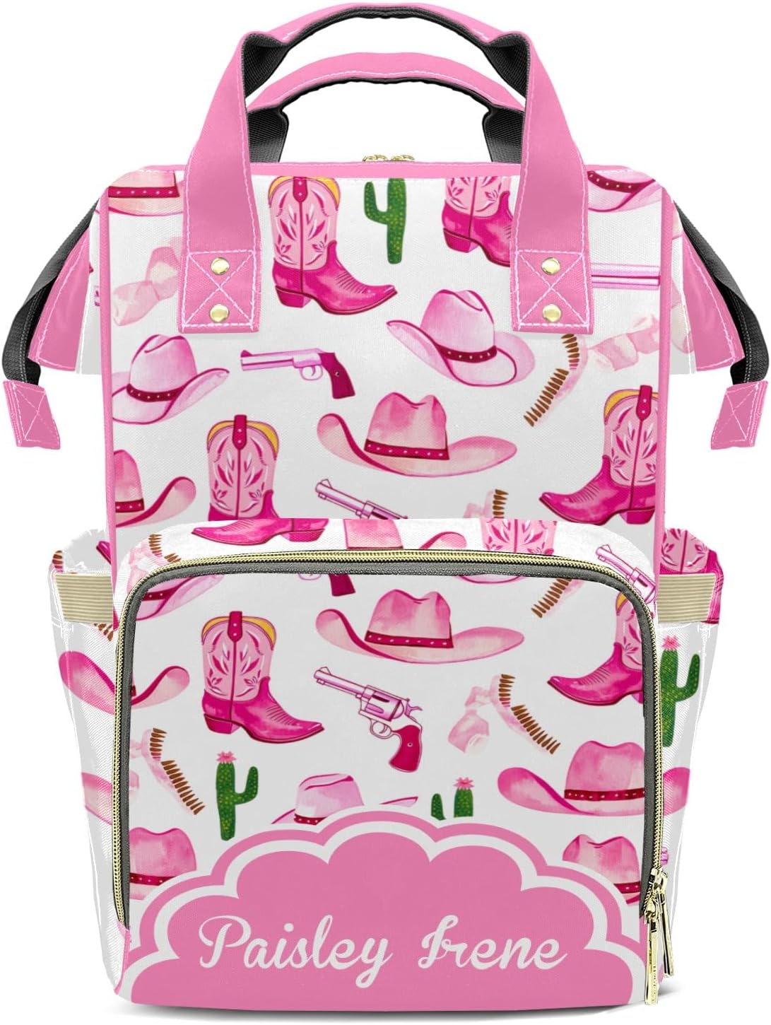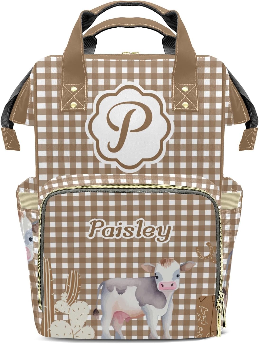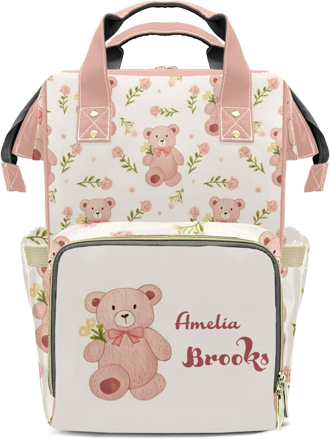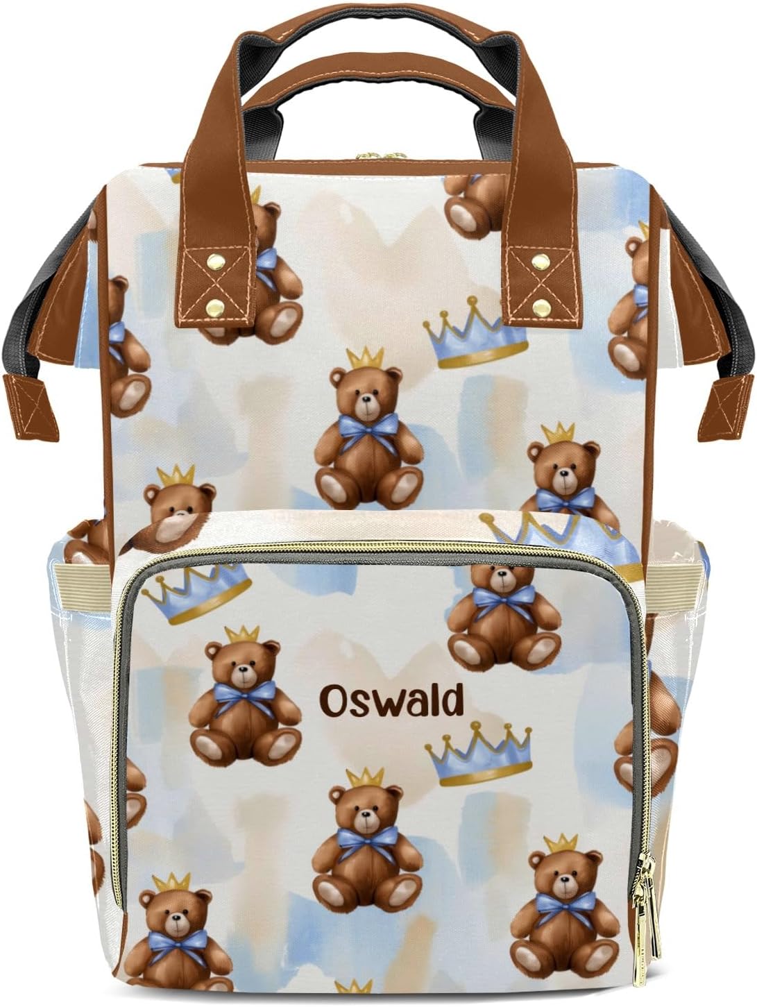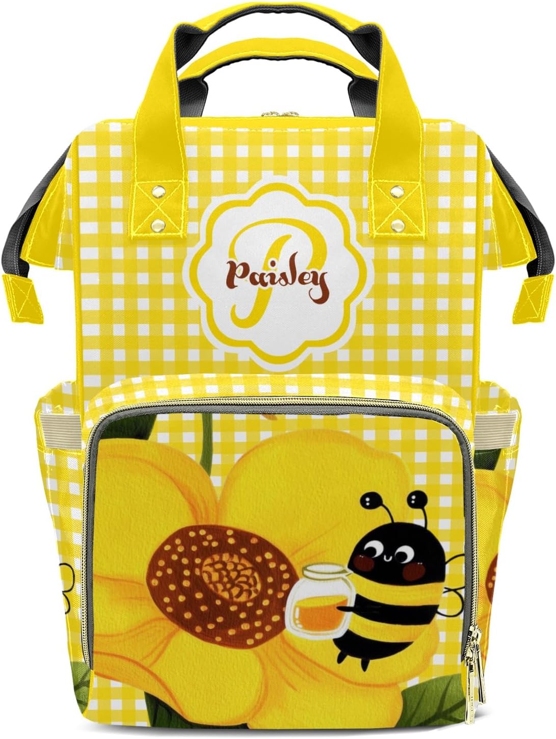 Personalized Name Multi-function Backpack/Diaper Knapsack /Tote Bag.Have everything you need while on the go with your little one.Padded Adjustable Shoulder Straps.Waterproof fabric, easy to wipe clean.Front compartment includes 3 seperate insulated pockets that can hold milk bottles. A mesh pocket featured.Measures: 10.83"(L) x 6.69"(W) x 15"(H) x 3.1"(Hand Drop)Zipper closure allows it easy to open and closeMulti function backpacks are suitable for many occasions.Applicable to: mother and baby travel, short trips, shopping, commuting, hospital prenatal check-ups, parent-child camping, etc.