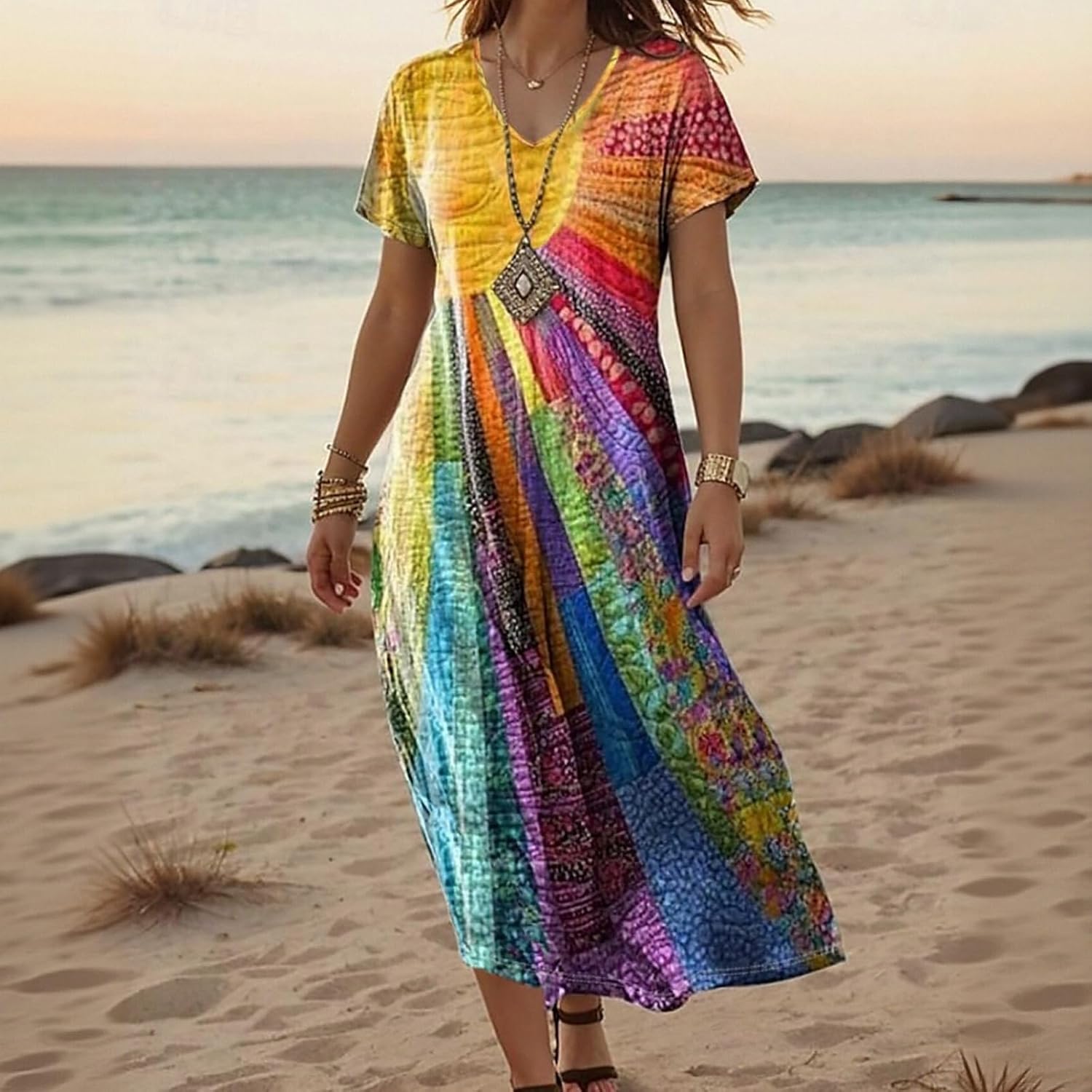 Women's Summer Boho Vacation Rainbow Gradient Print Sleeveless Maxi Dress Loose Flowy A Line Beach Sundress